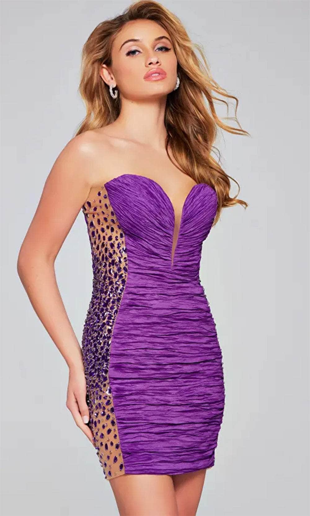 Make yourself the focus of everyone's attention on that homecoming night with the Jovani 39788 dress. This alluring dress sculpts your figure with expertly placed seams, creating a ruched silhouette that flatters your curves. The strapless bodice boasts a plunging sweetheart neckline, softened by an illusion modesty panel for a touch of elegance. Shimmering faceted stones adorn the sheer side panels, adding a touch of sparkle. The mid-rise back ensures a comfortable fit, while the concealed zipper closure provides a smooth and polished look. The sheath skirt with a short hem completes this stunning ensemble, making the Jovani 39788 a guaranteed head-turner at your next homecoming dance. Models are wearing the Black and Purple colors.