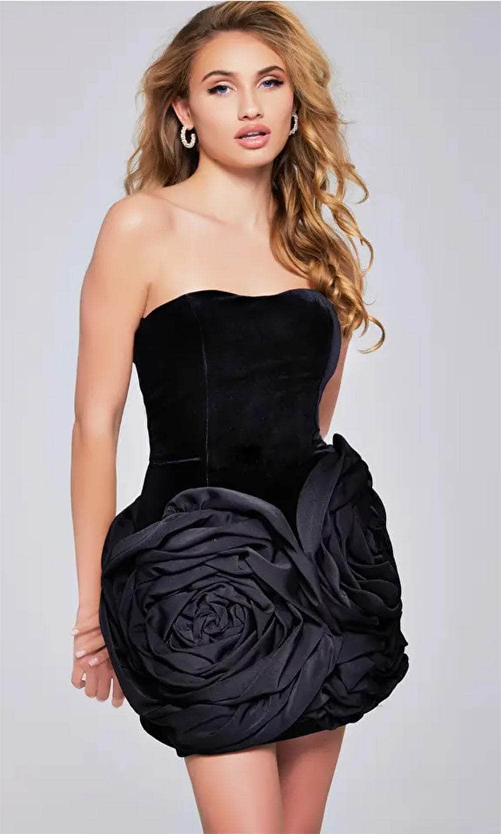 Look amazing wearing the gorgeous Jovani 39848 cocktail dress, which is a sophisticated choice for any elegant event. Tailored from luxurious velvet fabric, this stunning dress features a strapless fitted bodice with clean seams and a straight-across neckline. The back zipper closure ensures a perfect fit. The dress is completed with a short-length sheath silhouette skirt adorned with delicate rose detailing. Exude elegance and charm with the Jovani 39848, a dress that promises to make a memorable impression. Models are pictured wearing Red, and Black colors.