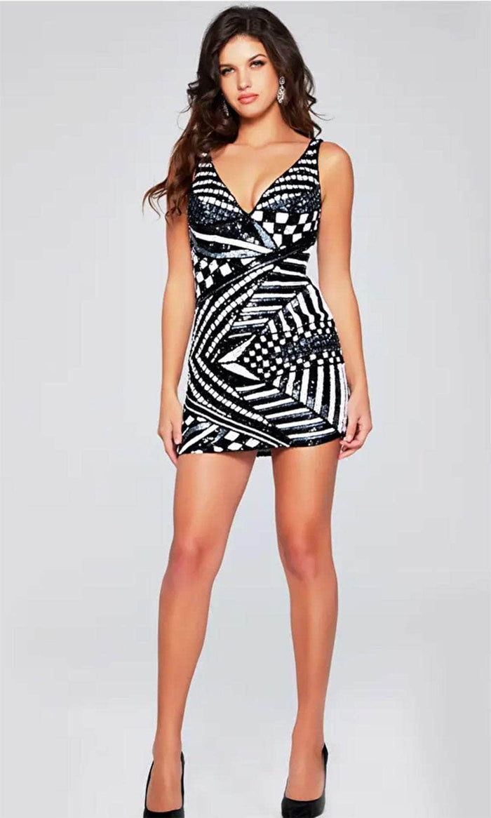 Strike a big statement with the Jovani 39952 cocktail dress, a radiant choice for any special occasion. Adorned with sequins, this enchanting dress features a sleeveless fitted bodice and a V-neckline that perfectly complements the V-shaped back. The back zipper closure ensures a flawless fit. Completing the look is a short-length sheath silhouette skirt, adding a touch of sophistication and allure. Shine with the Jovani 39952, a dress that promises to leave a lasting impression. Model is wearing Black/White color.