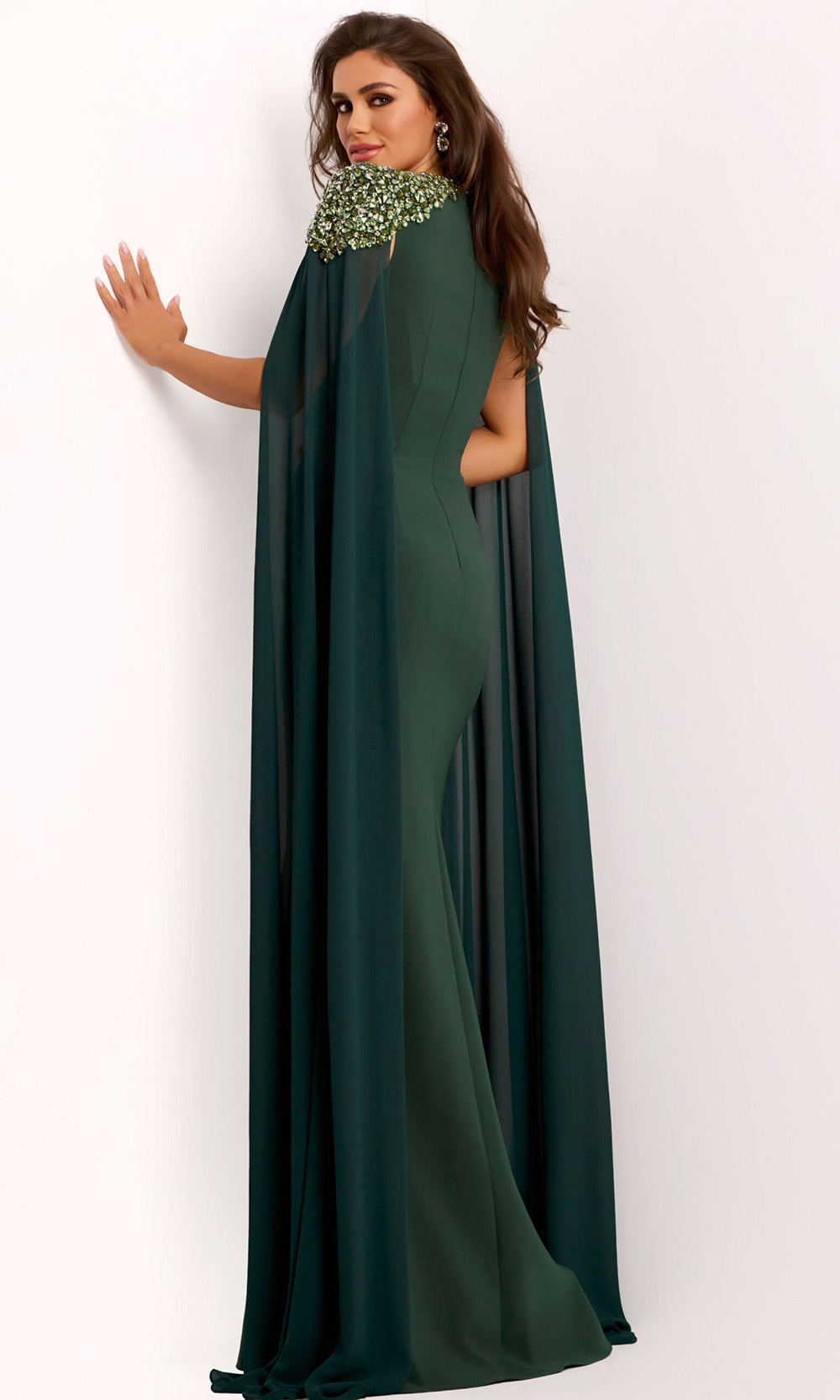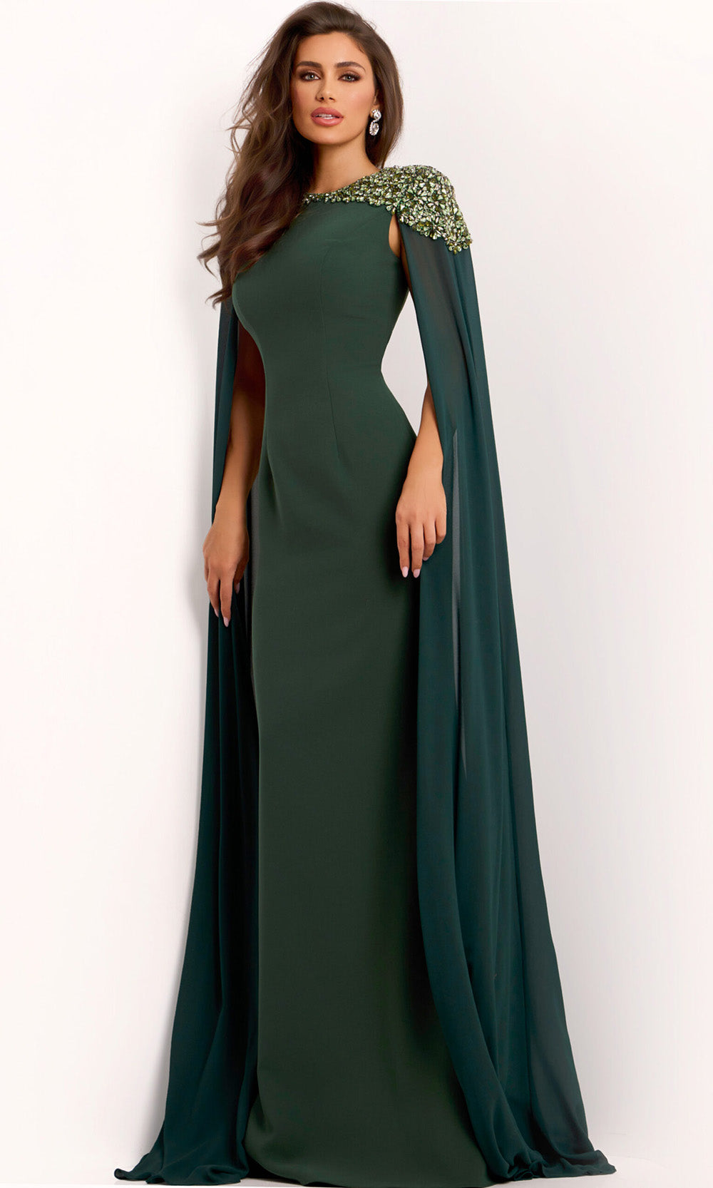 Make a glamorous entrance worthy of the red carpet in this Jovani 40000 style. The gown commands attention with its dramatic chiffon cape sleeves that flow effortlessly with each step. A sleek jewel neckline creates a sophisticated frame, while intricate beadwork adorns the shoulders for a touch of sparkle. The sheath silhouette enhances natural curves, and the minimalist design allows the statement cape to take center stage. Perfect for those seeking elegance with a bold twist, the Jovani 40000 offers a unique balance of grace and drama for unforgettable entrances. Model is wearing Hunter color.