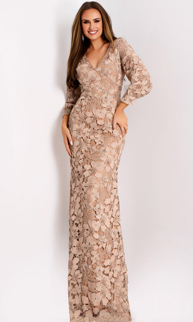 Elegance finds new expression in this Jovani 40210 floral lace gown, where classic charm meets modern fit. The deep V-neckline frames the face beautifully while elongating the figure, complemented by long sleeves for a refined finish. Its embroidered lace overlay creates dimension and romance, while the fitted sheath silhouette enhances natural curves. The floor-length hem completes the polished look, ensuring poise from every angle. The Jovani 40210 is the ideal choice for those seeking a graceful yet contemporary statement at their most cherished celebrations. Model is wearing Beige color.