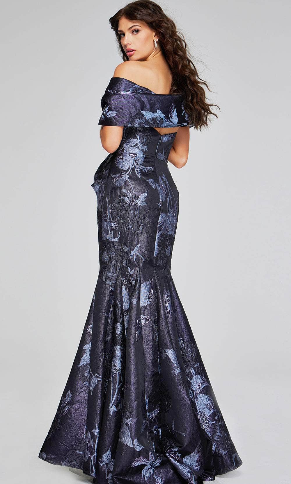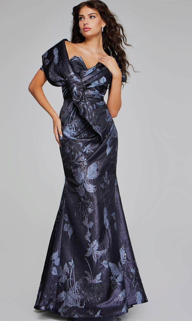 Create timeless memories in this eye-catching Jovani 40309 masterpiece. This glamorous jacquard gown features a strapless silhouette detailed with exquisite floral pattern. The ruched detailing on the bodice adds romance and accentuates your hourglass curves. Sculpted in an enchanting mermaid silhouette, the skirt cascades to the floor length hem and is accented with godets for a dramatic and elegant look. The included matching shawl offers wonderful coverage. In a poised Jovani 40309 gown, you exude statuesque elegance. Model is wearing Grey Multi color.
