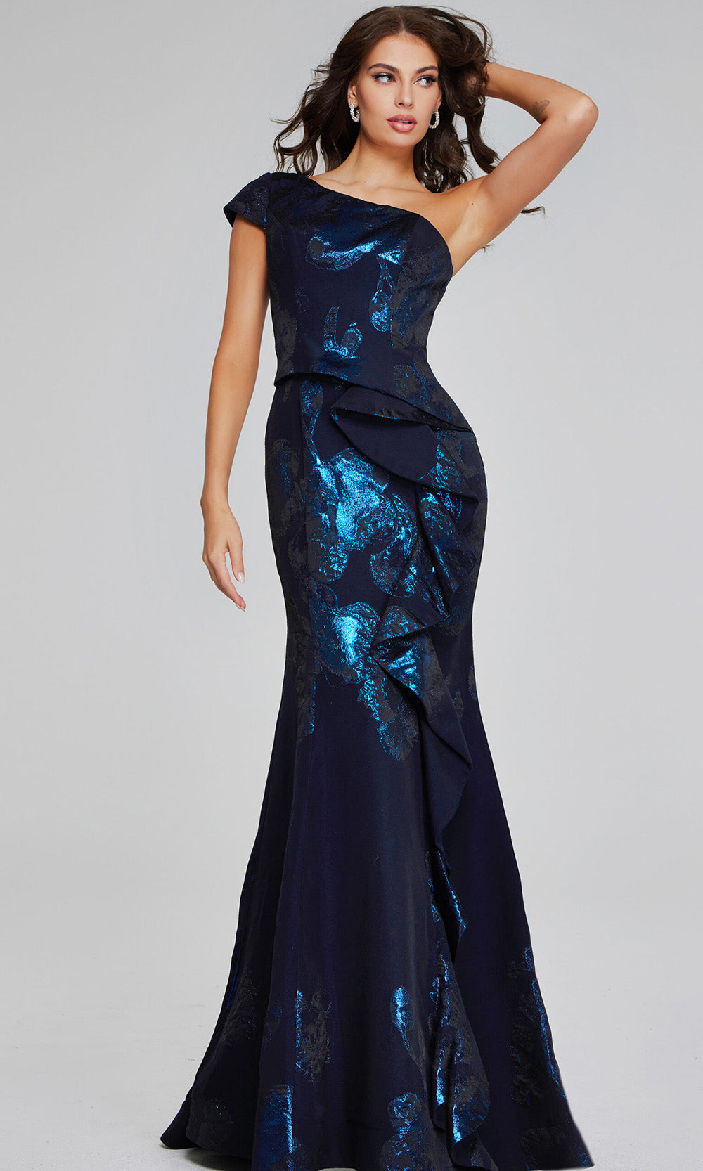 | Details: | One Shoulder Cap Sleeve, Cascading Side Ruffle, Metallic Floral Pattern, Sweep Train |