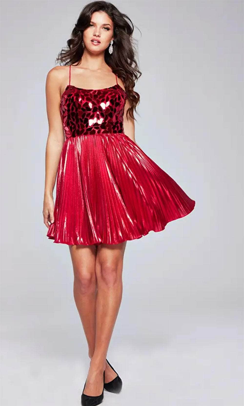Exude modern sophistication at your next homecoming in the Jovani 40350 cocktail dress. Exceptional craftsmanship tailors the dress to perfection, sculpting a captivating metallic silhouette that enhances your natural curves. Delicate spaghetti straps and a chic scoop neckline strike a balance with the dress's flair, while the intricately placed cut glass details on the bodice add a touch of shimmer. The alluring open back, adorned with a detailed lace-up closure, adds to the ensemble's allure. With each step, the pleated A-line skirt moves gracefully, ending in a short hem that ensures you'll command attention. The Jovani 40350 cocktail dress promises a sophisticated statement for a memorable homecoming. Models are wearing the Lilac, Red, and Teal colors.