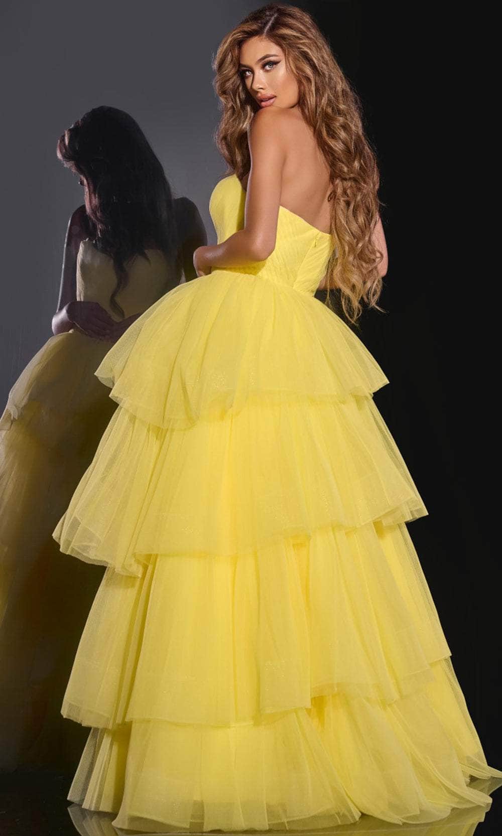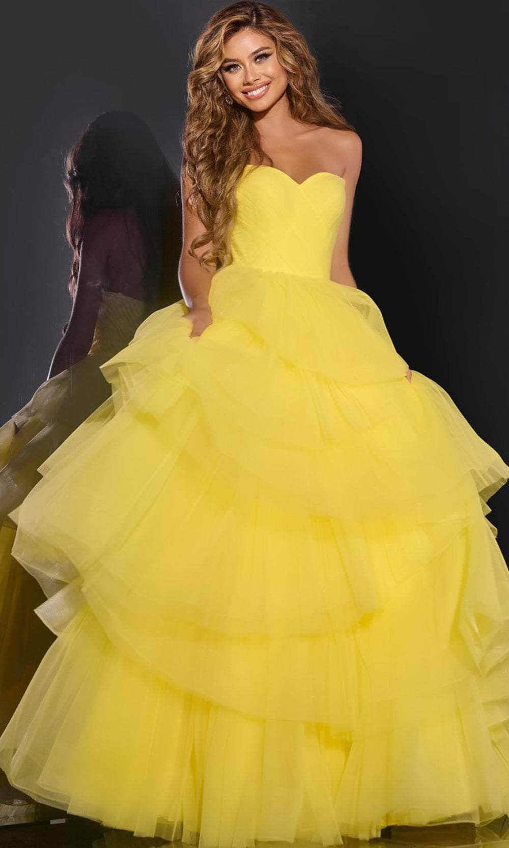 Designed for those who seek timeless elegance, this Jovani 40394 prom dress features a strapless sweetheart neckline that beautifully frames the chest and shoulders. The fitted bodice leads to a magnificent layered tulle skirt, creating a voluminous and captivating silhouette. This floor-length ball gown is perfect for making an entrance at any formal occasion, combining sophistication and beauty in one unforgettable piece. Elegance and beauty combine in the Jovani 40394 ballgown. Model is wearing the Yellow color.