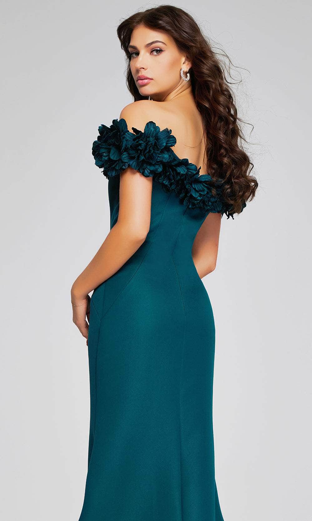 Strike a pose as you walk to the hall in this captivating Jovani 40595 creation. Ornamented with 3D floral appliques on the sweetheart off-shoulder neckline and cap sleeves, this gown exudes elegance and glamour. A seamless fit is guaranteed by the concealed zipper closure in the mid-open back. To elevate your curves, the skirt forms a mermaid silhouette that smoothly descends to the floor and sweeping denouement. Fall in love with the beauty of this Jovani 40595 masterpiece. Model is wearing Emerald color.