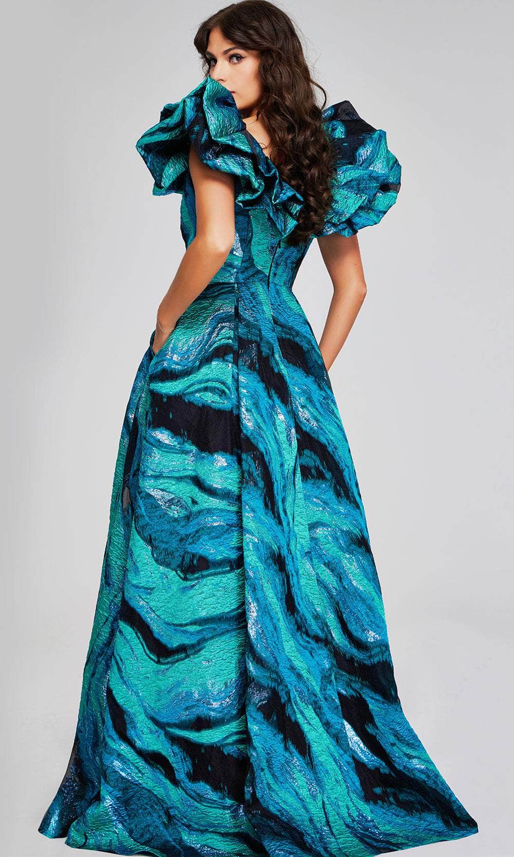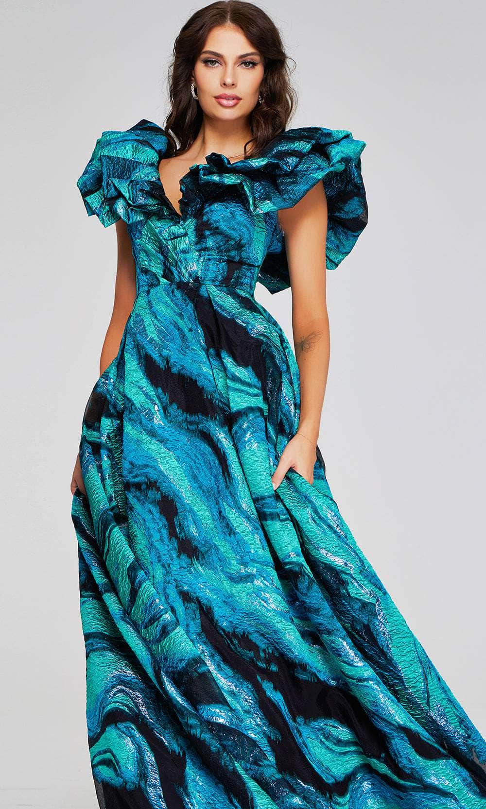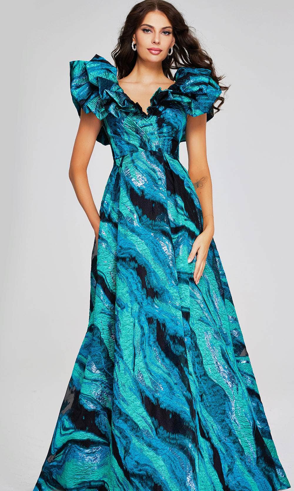 Look elegant with this Jovani 40696, a masterpiece of elegance and style. This stunning gown features a V-neckline and ruffled sleeves, adding a feminine and sophisticated flair. The gown is secured with a center zipper closure at the back, ensuring a perfect fit. Its floor-length skirt, accented with side pockets, boasts an A-line silhouette that beautifully highlights your figure and ends with a graceful train. Ideal for formal occasions, this Jovani 40696 epitomizes timeless elegance and modern charm. Model is wearing Teal/Multi color.