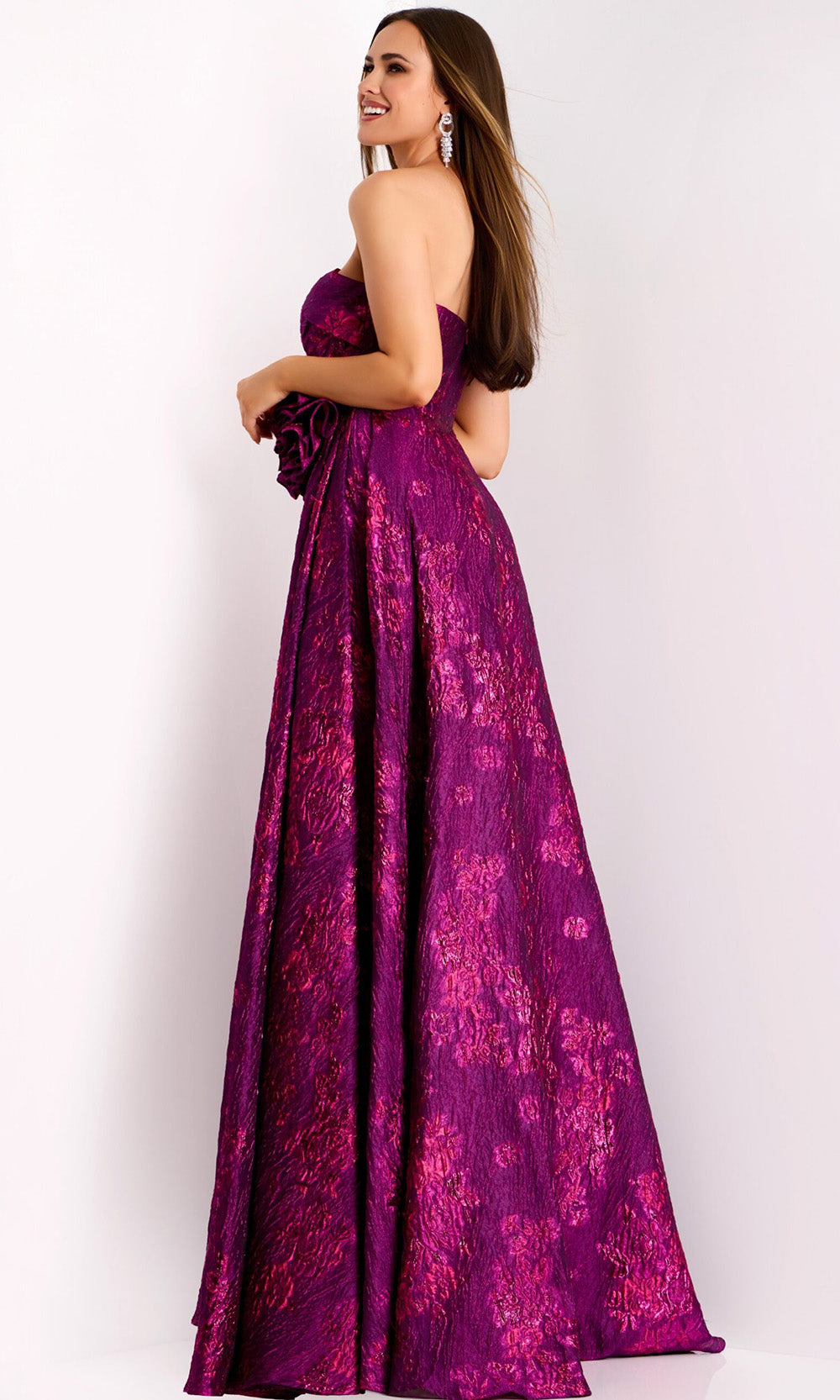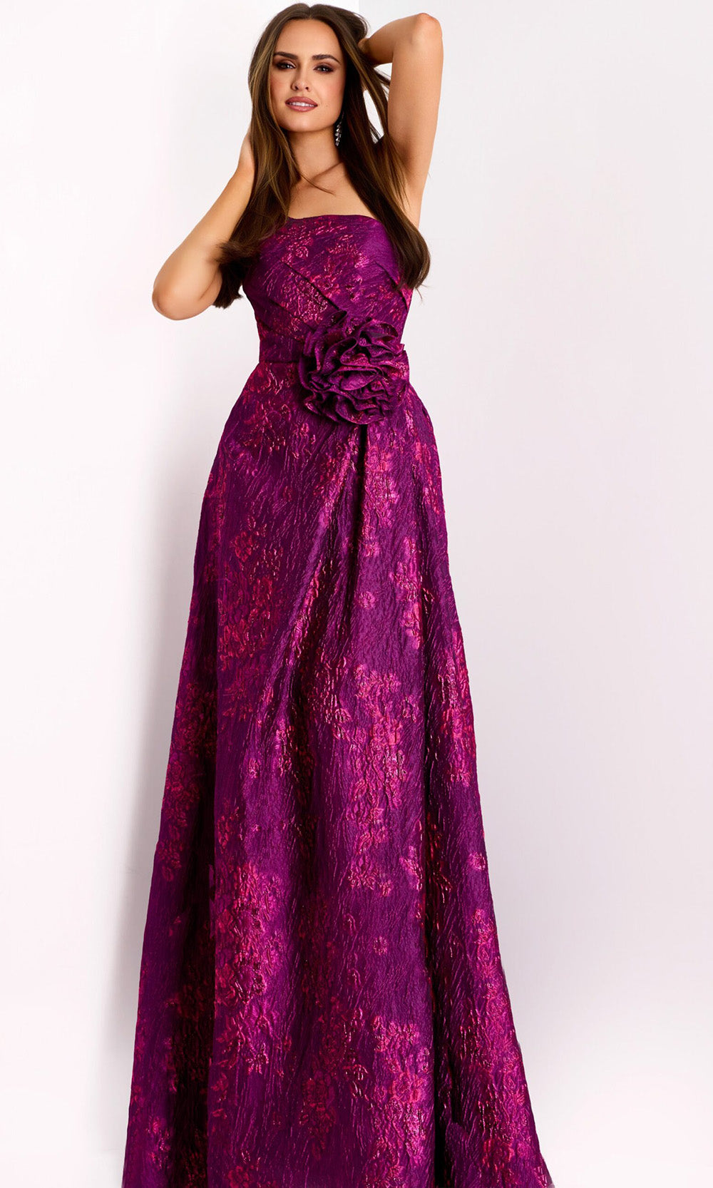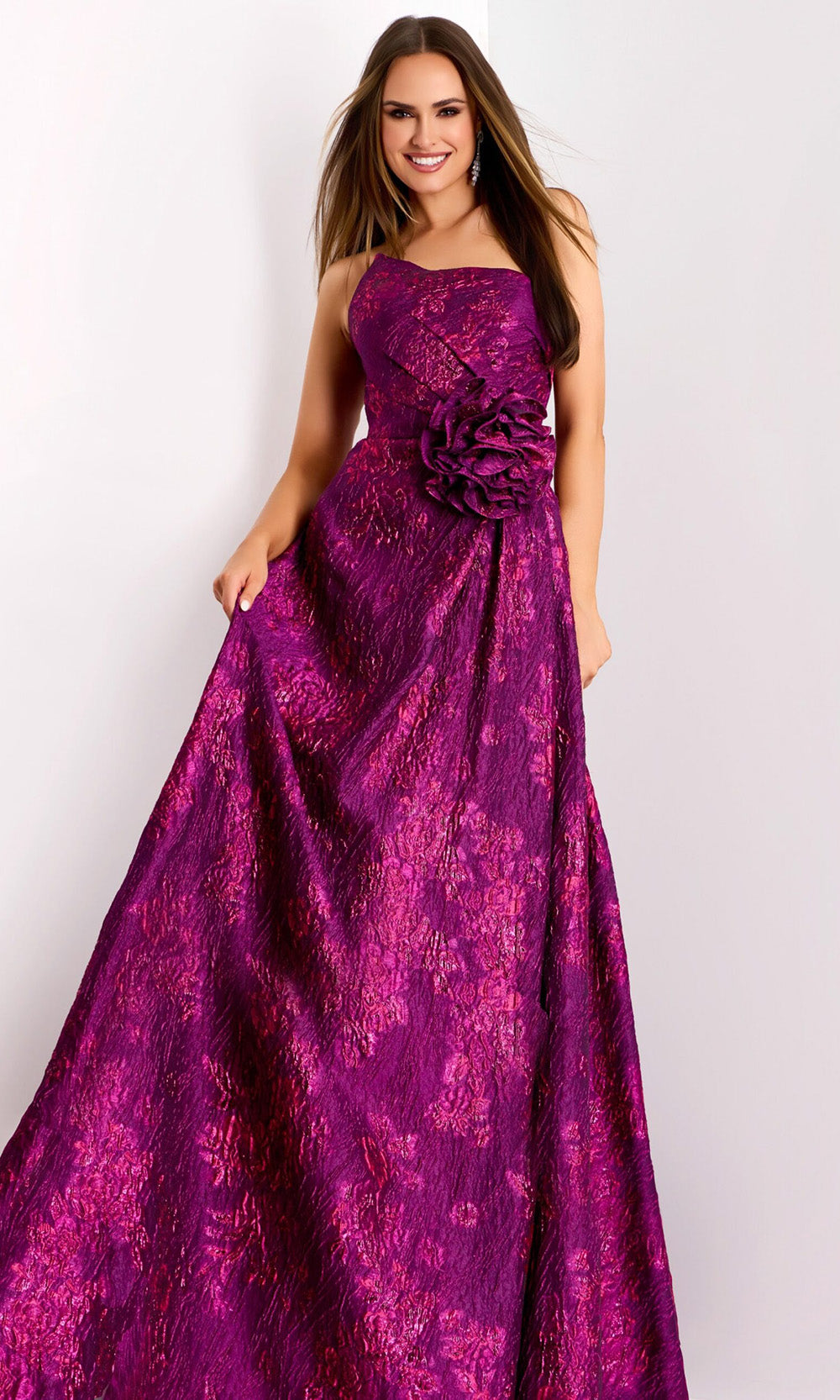 Charming and refined, this Jovani 40780 floral jacquard gown showcases a timeless design with thoughtful accents. The asymmetric neckline and strapless cut frames the collarbone elegantly, leading the eye to a beautifully crafted 3D floral applique at the waist. An A-line skirt flows gracefully to the floor, creating a sense of movement with every step. The natural waistline ensures a flattering fit while maintaining classic proportions. The Jovani 40780 blends elegance and detail for a look that remains effortlessly stylish from every perspective. Model is wearing Fuchsia color.