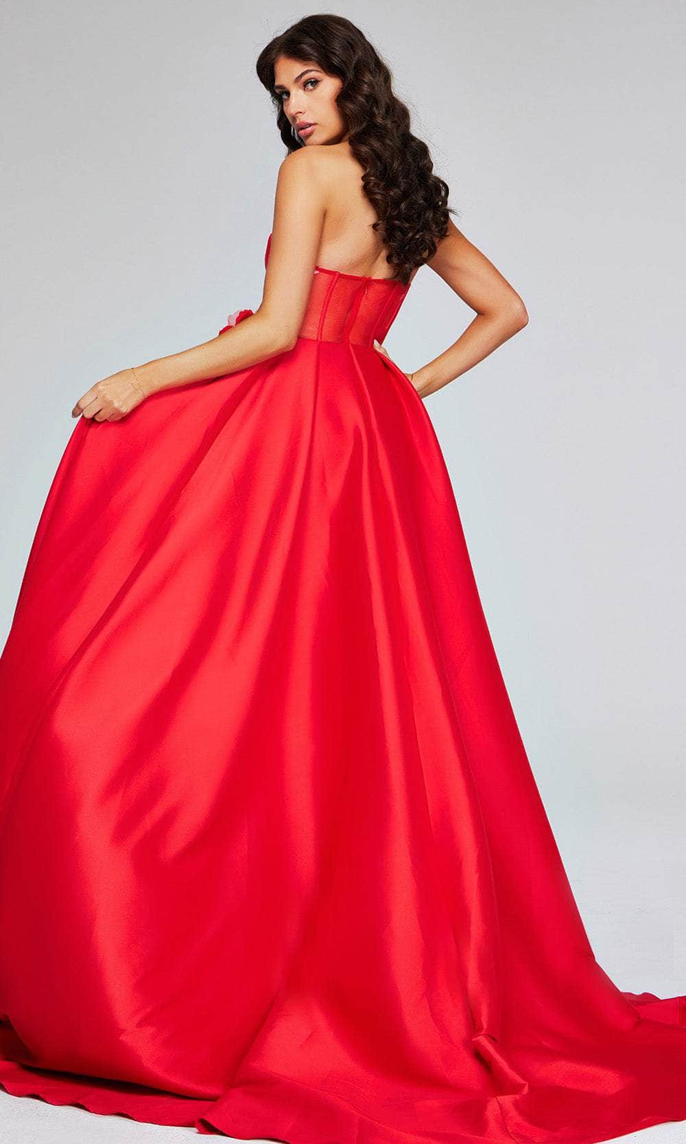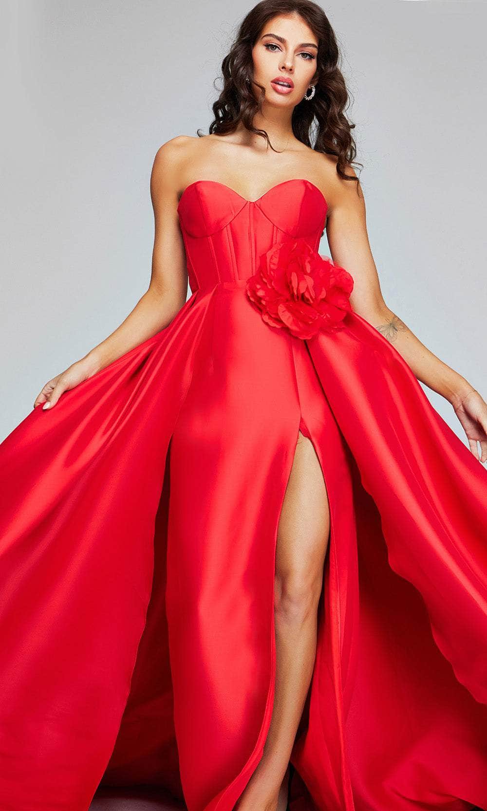 Capture everyone attention with the regal beauty of this Jovani 40826 gown. Designed in a glamorous strapless silhouette, the gown exhibits a sweetheart neckline, and a corset boning bodice that contours your body beautifully. The 3D floral accent adds femininity, while the midrise illusion back is fastened by a zipper closure. The fitted sheath skirt breaks a thigh-high leg slit, and is intensified by the pleated A-line overskirt that gives movement and grace. This Jovani 40826 gown is undoubtedly stylish and comfortable. Stay right on trend with this Jovani 40826 masterpiece. Model is wearing Red color.