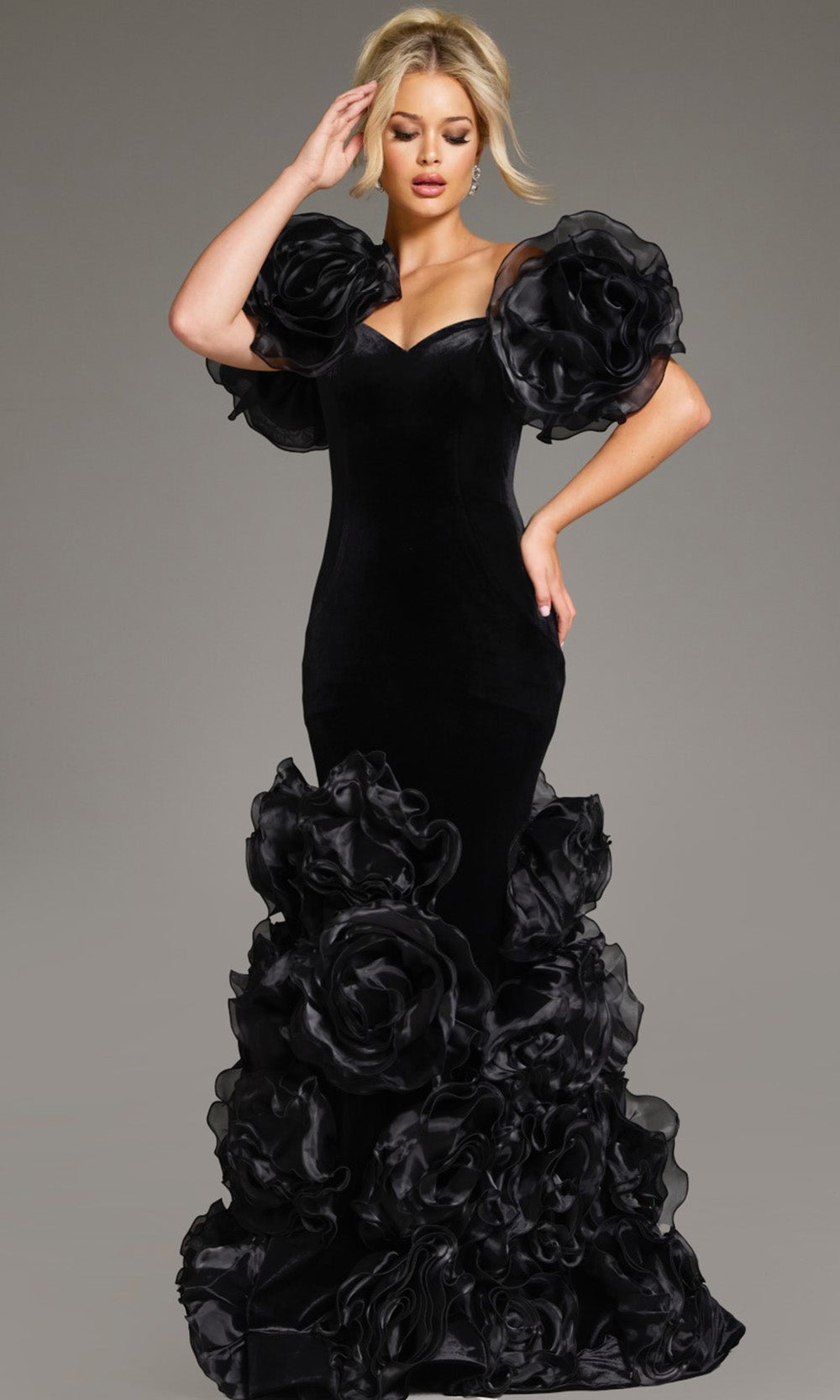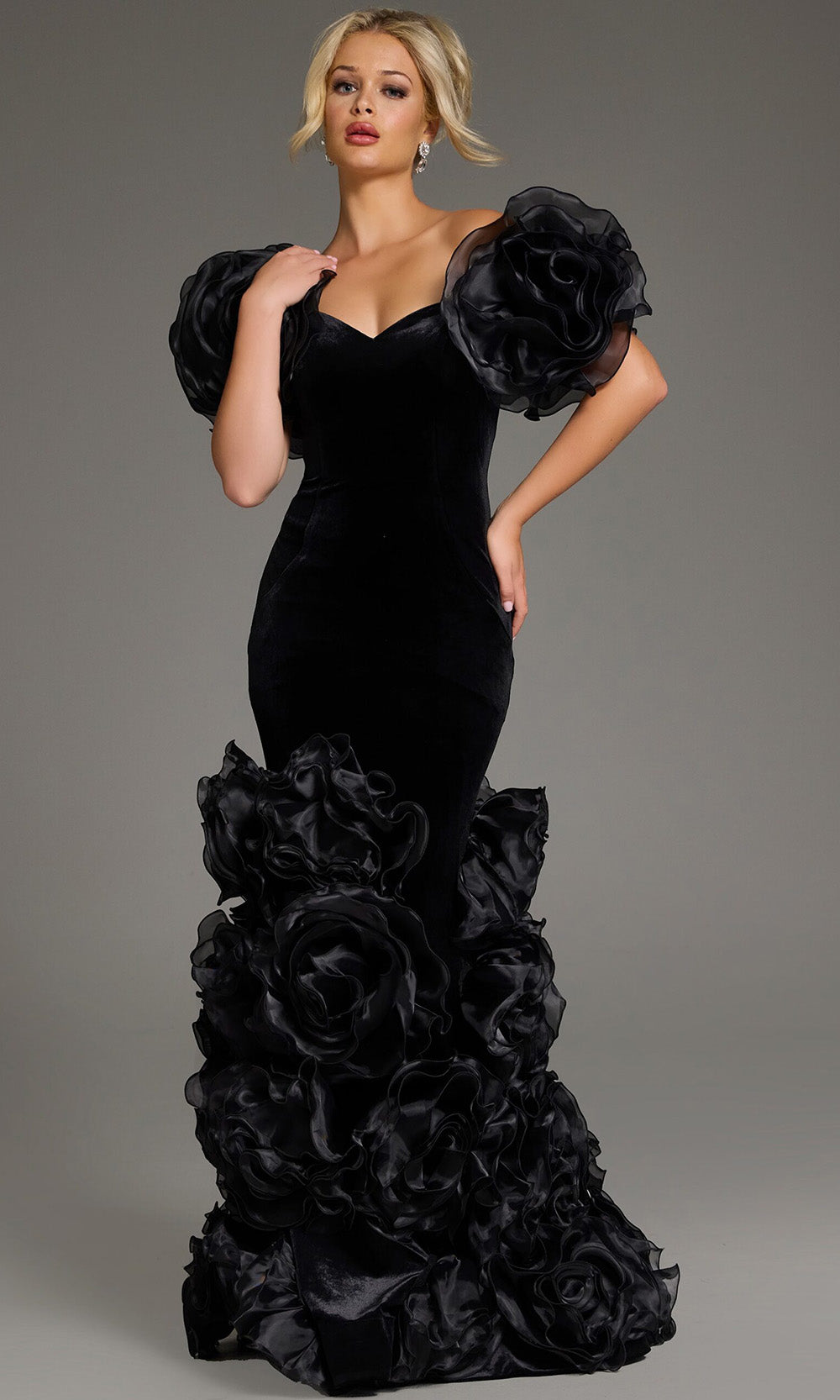 Romantic drama comes alive in this Jovani 40843 velvet gown, where bold floral appliques create a striking visual along the sleeves and skirt. The sweetheart neckline frames the collarbone beautifully, while the sculpted bodice transitions smoothly into a flared trumpet skirt. The off-shoulder puff sleeves adorned with oversized floral detailing, add depth and couture flair. Ending in a graceful floor-length hem, the Jovani 40843 is the perfect expression of confidence and artistry for a grand entrance at any formal occasion. Model is wearing Black color.
