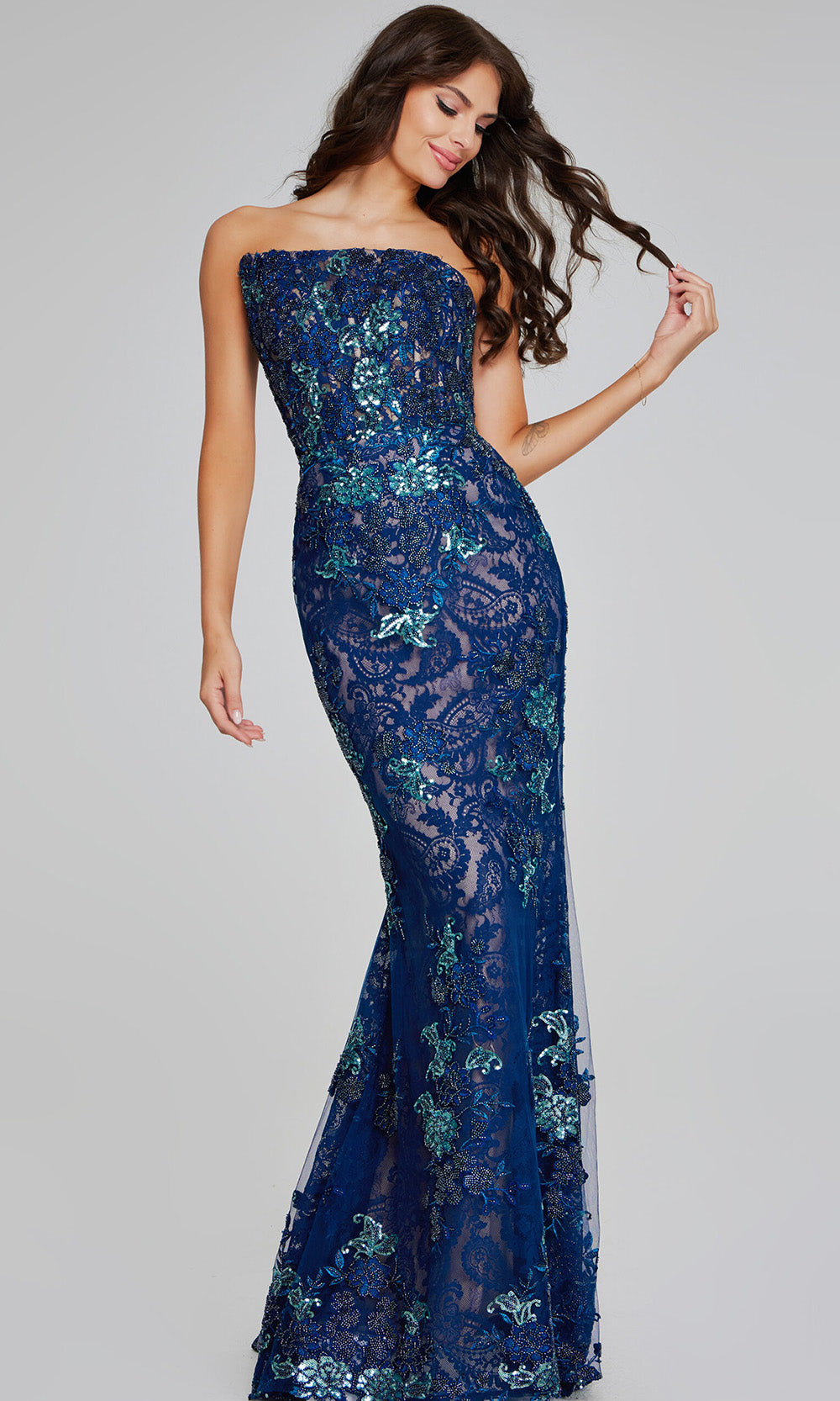 A vision of sophistication unfolds in this Jovani 40847 floor-length gown, where every detail is thoughtfully placed to enhance its refined charm. The fitted silhouette is enhanced with asymmetric strapless neckline, exuding timeless appeal. All-over lace with shimmering sequins and beading brings dimension to the sheer overlay, adding texture and artistry. The design celebrates elegance through a form-flattering fit that complements the wearer poise. Jovani 40847 is the perfect expression of glamour for special occasions, pairing intricate beadwork with an alluring, figure-focused shape. Model is wearing Navy color.