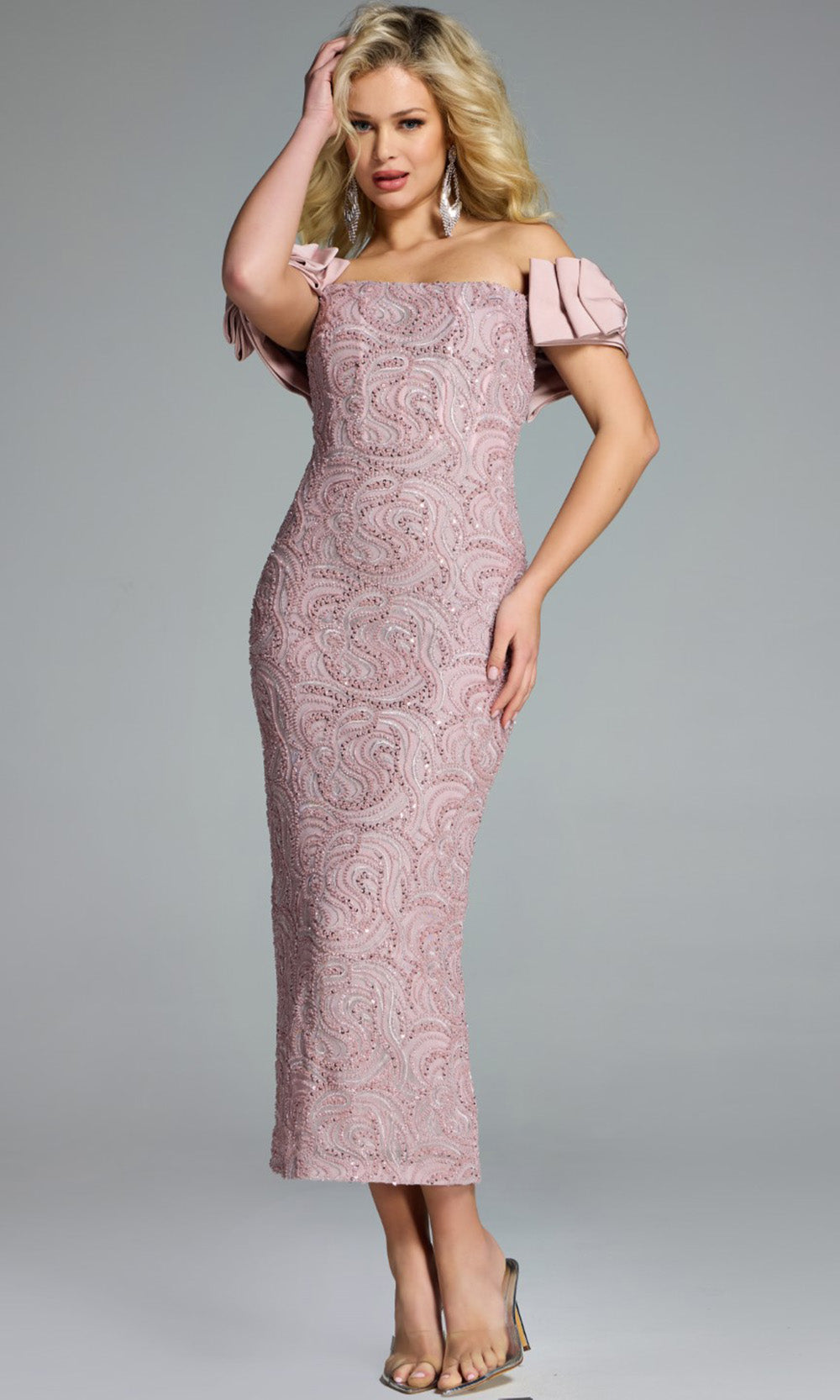 Understated sophistication defines this Jovani 41044 tea-length column dress, where every element contributes to an effortlessly refined look. The straight-across off shoulder neckline is complemented by short bow sleeves, adding a feminine charm. Intricate beadwork adorns the entire design, delivering texture and sparkle. The fitted silhouette follows the body natural shape, creating a polished finish. Jovani 41044 is a versatile choice for moments that call for graceful elegance and confident style. Model is wearing Mauve color.