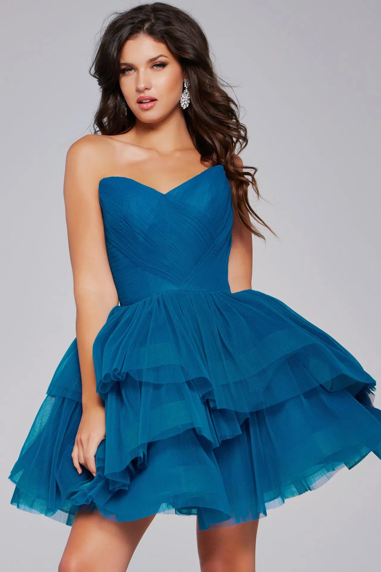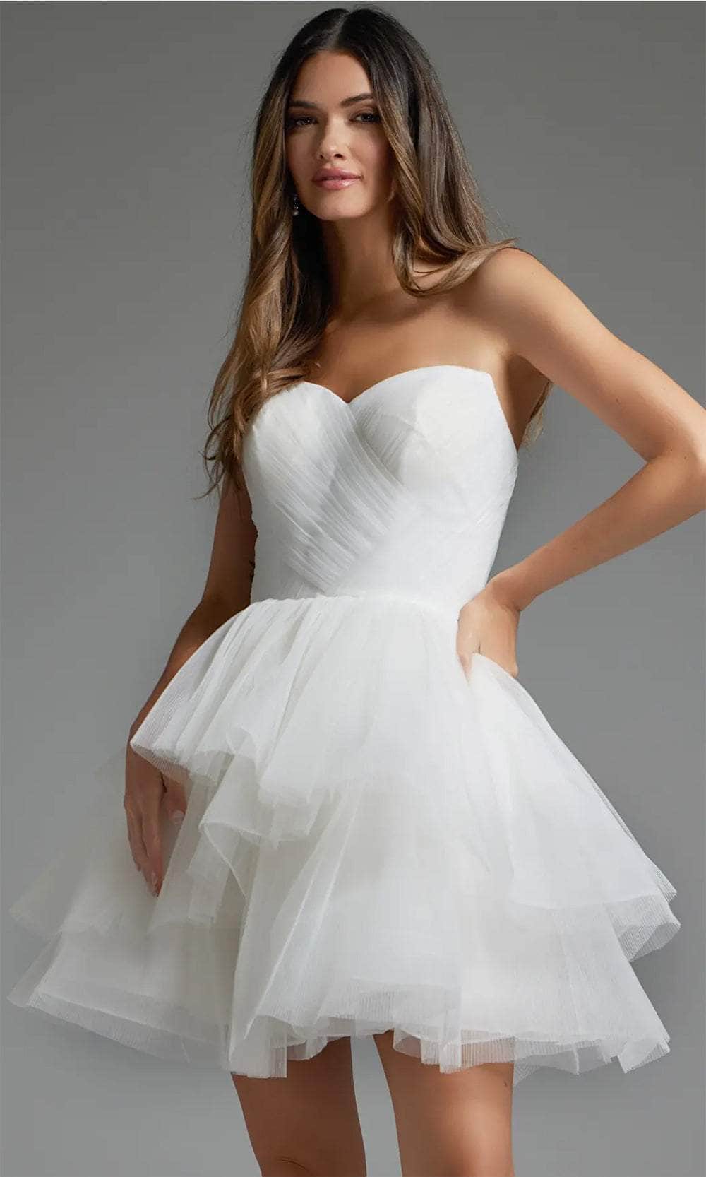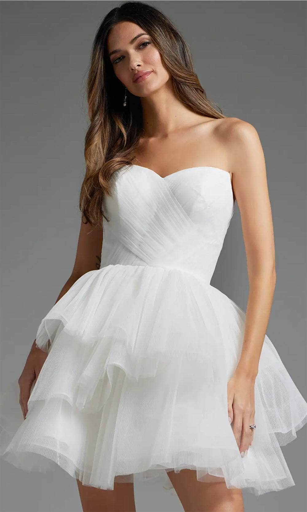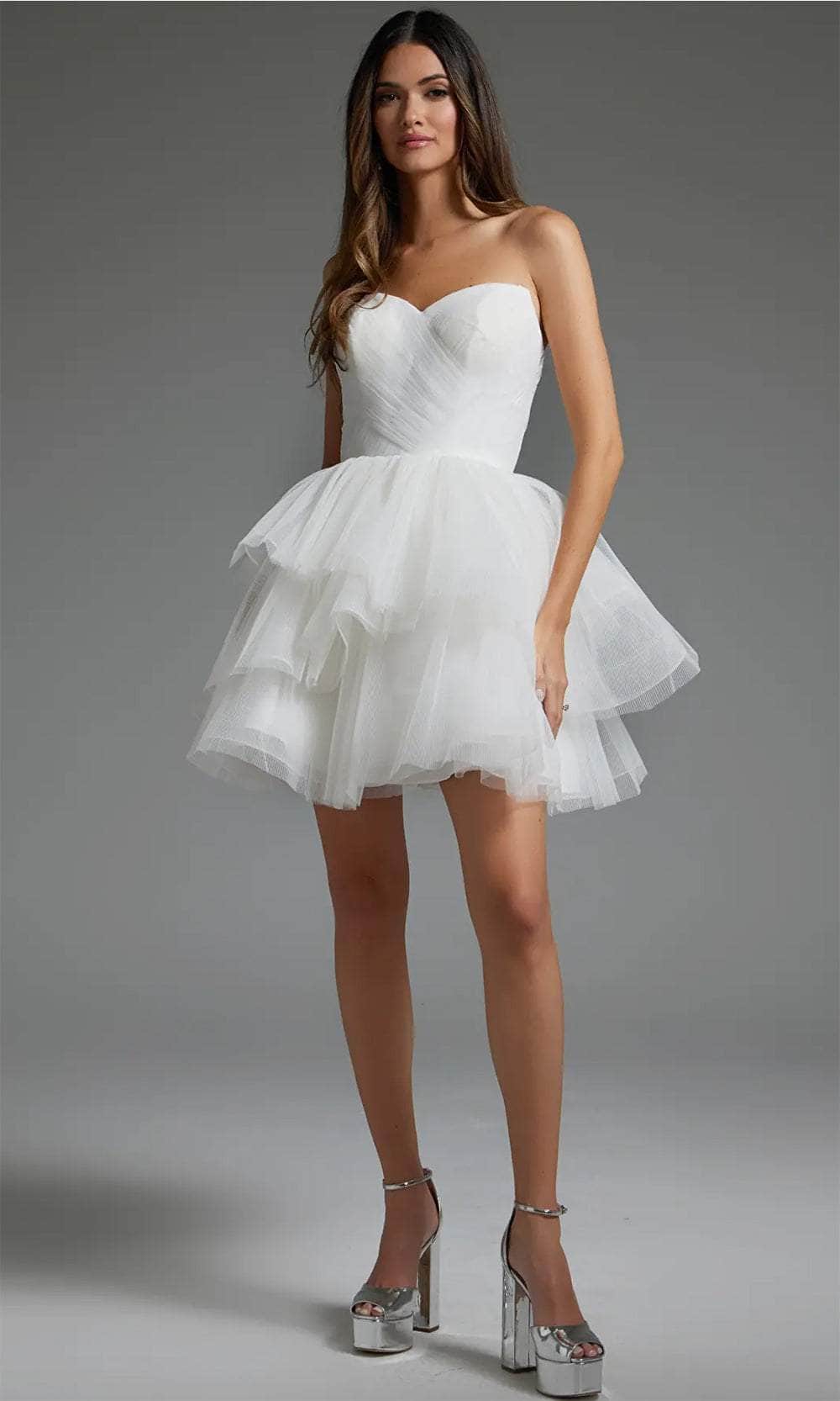 Mesmerize from every angle with your feminine flair in this Jovani 41054 masterpiece. This strapless ensemble ruched details on the upper bodice create a captivating texture and style. The sweetheart neckline adds a touch of romance, while the semi-open back has a concealed zipper closure to hold everything together. For a dramatic finish, the skirt highlights the layered ruffle design and it forms into fabulous A-line silhouette that drops to the short hemline. This Jovani 41054 dress is perfect for cocktail parties and any events. Models are pictured wearing the Peacock, and Off-White colors.