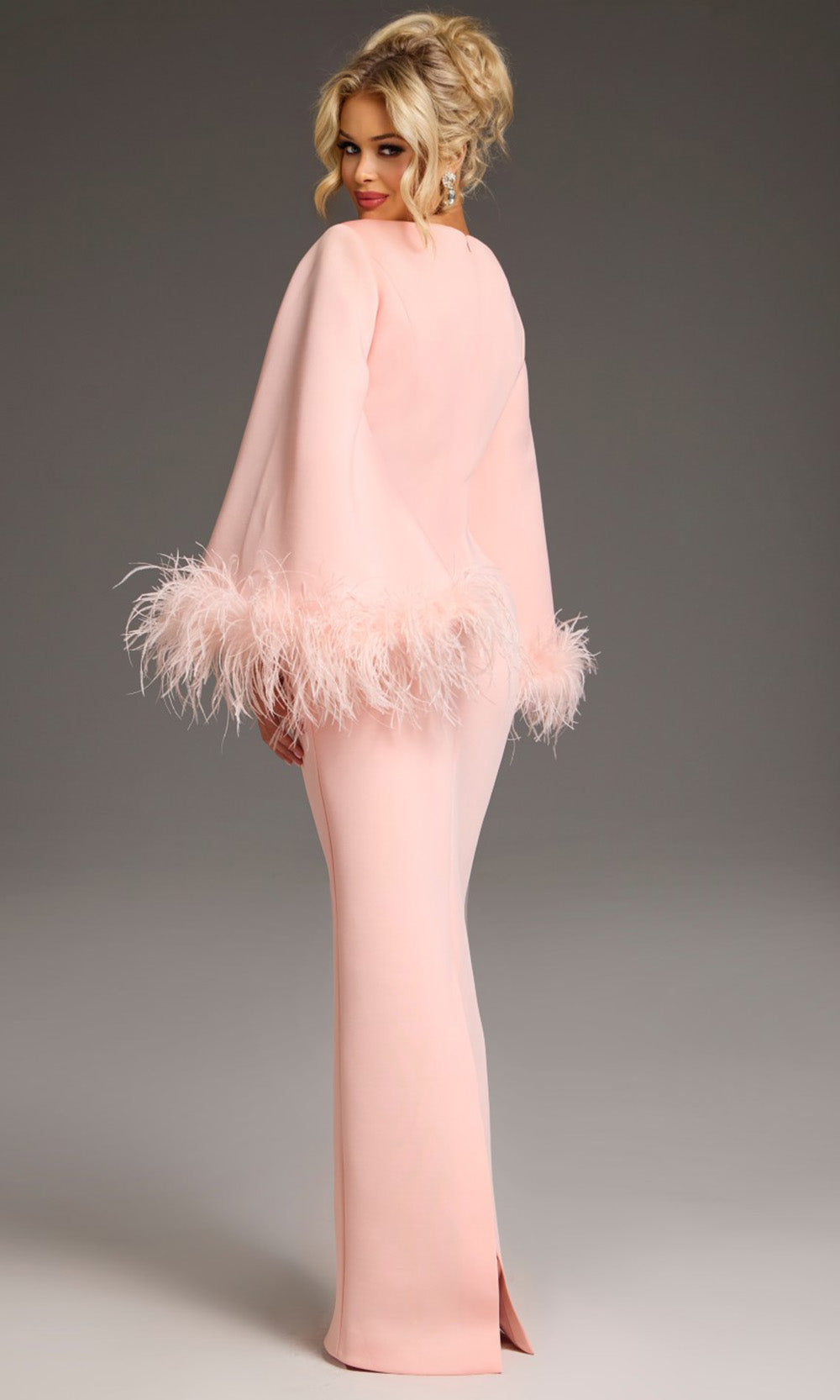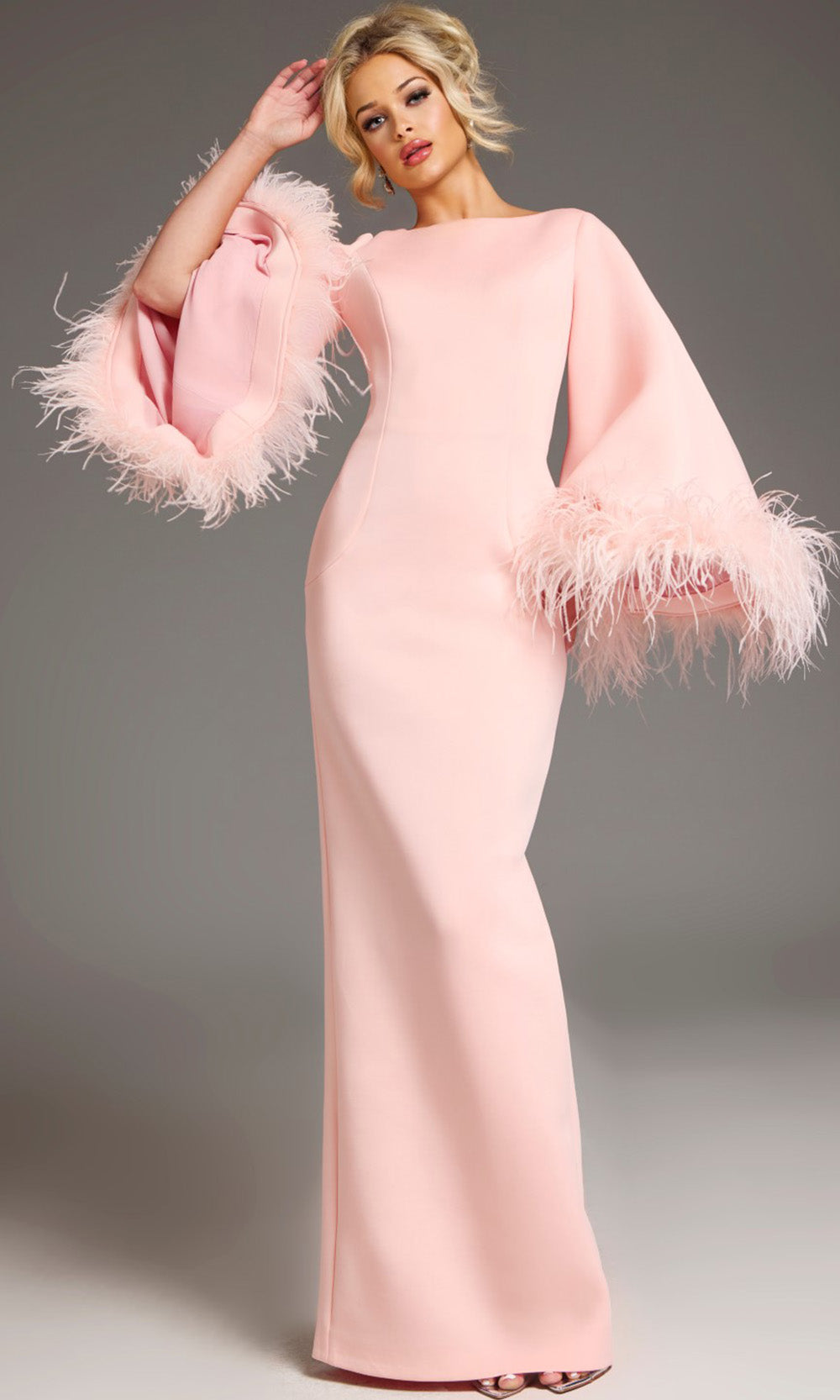 Understated elegance meets playful detailing in this Jovani 41077 floor-length satin gown. The bateau neckline creates a modest yet refined frame, while dramatic wide bell sleeves bring a touch of whimsy with their feather-trimmed edges. The column silhouette offers a clean and elongated line from the natural waist to the hem, balancing the bold sleeve design. The Jovani 41077 merges timeless tailoring with a subtle fashion-forward twist, making it a standout in any formalwear collection. Model is wearing Blush color.