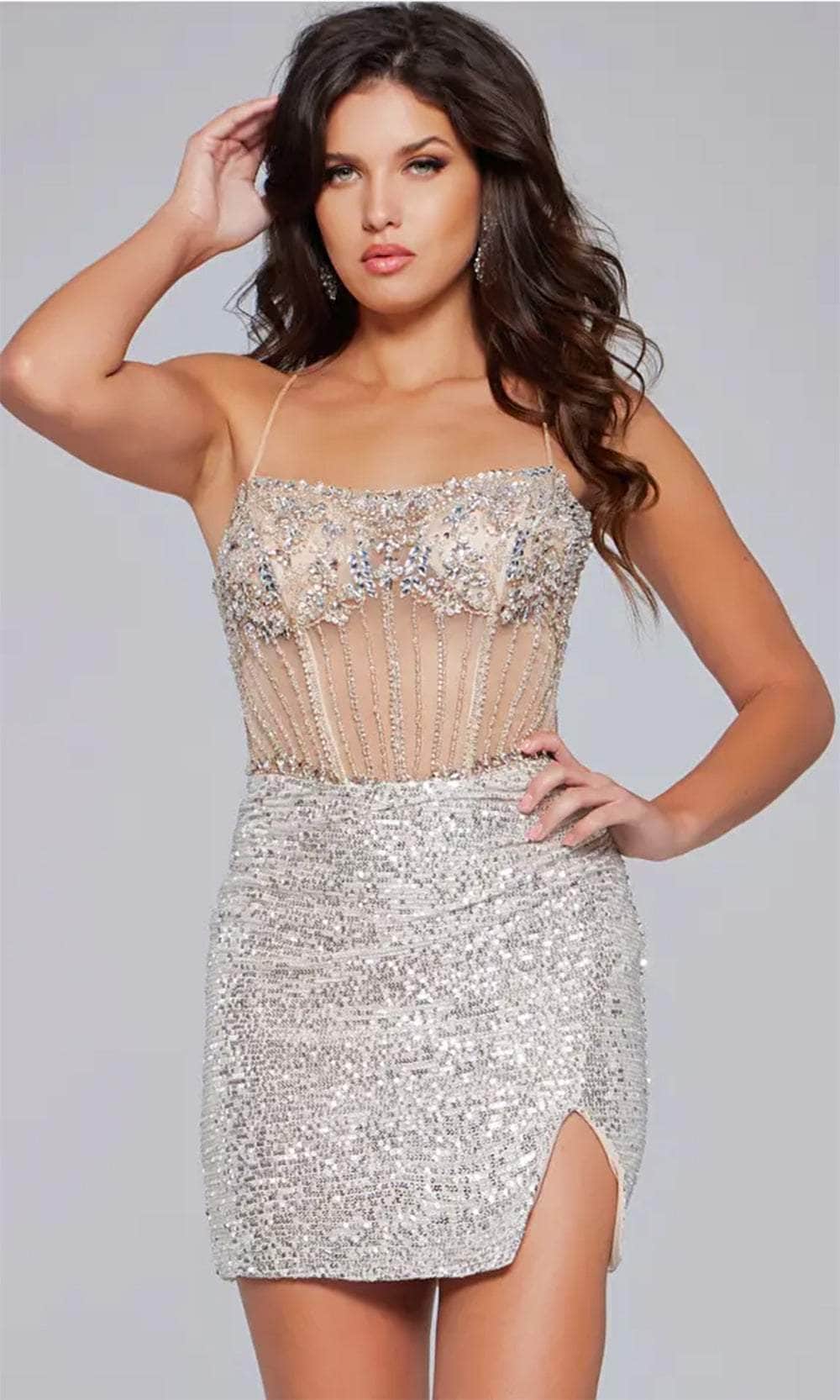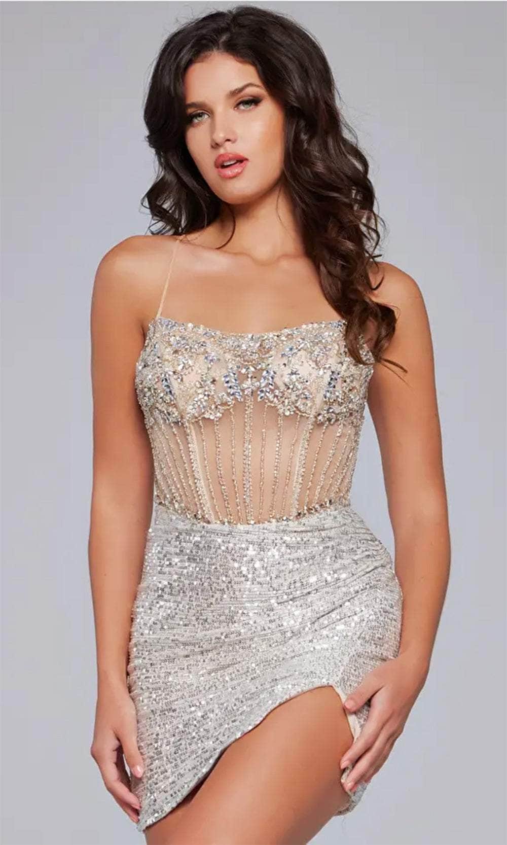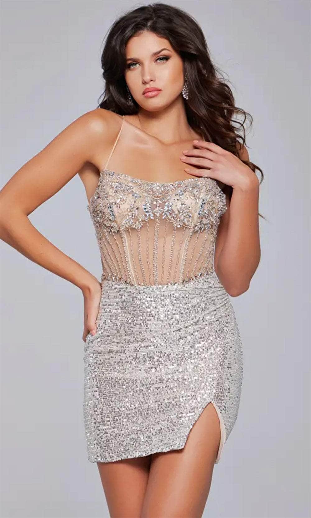 Make a big impression on any special occasion with the gorgeous Jovani 41090 cocktail dress. Attractive dress with a scoop neckline and a sleeveless sheer corset bodice embellished with sparkling rhinestones. For a secure fit, the back has a center zipper fastening. An elegant touch of refinement is added to the ensemble with a short sheath silhouette skirt. The Jovani 41090 dress is made to capture and fascinate, so make an impression that will last. Model is wearing Champagne color.