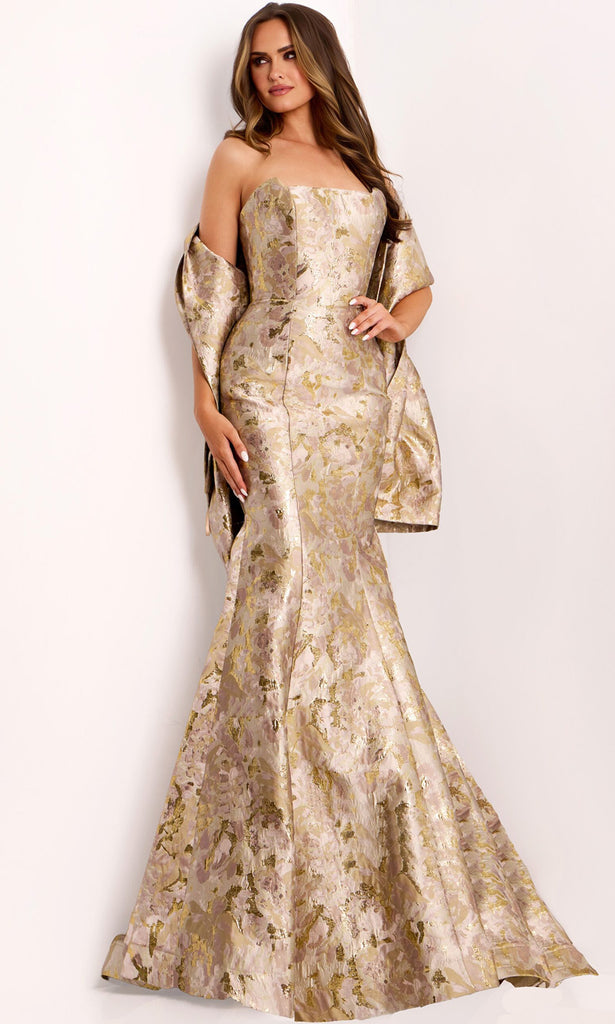 A gown that exudes presence, Jovani 41131 is perfect for moments where elegance is paramount. Its strapless straight across neckline frames the shoulders with understated charm while the fitted bodice enhances the natural waist. The mermaid skirt shapes the figure before flowing into a sweeping hem, and the oversized bow at the back adds a dramatic twist to the design. Every seam is carefully placed to create a sculpted silhouette. Jovani 41131 offers a combination of refinement and statement appeal, ensuring a lasting impression at the most distinguished gatherings. Model is wearing Taupe/Gold color.