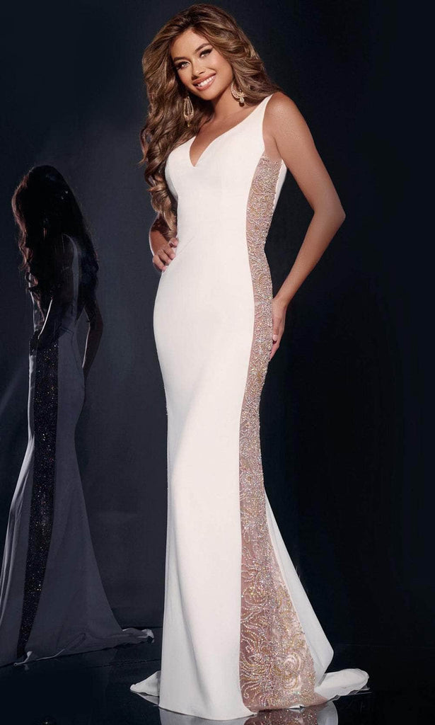 Radiate elegance in the Jovani 42025 evening gown, which blends glamour with classic sophistication. The gown features sheer side panels, intricately embellished with crystal beading that enhances its dazzling appeal. A V-neckline and sleeveless design offer a chic, timeless look, while the crepe fabric contours the body for a flattering silhouette. With its dramatic open V back, this gown adds a touch of allure, making the Jovani 42025 gown perfect for red carpet events, galas, or any occasion where you want to shine. Model is wearing the Off White color.