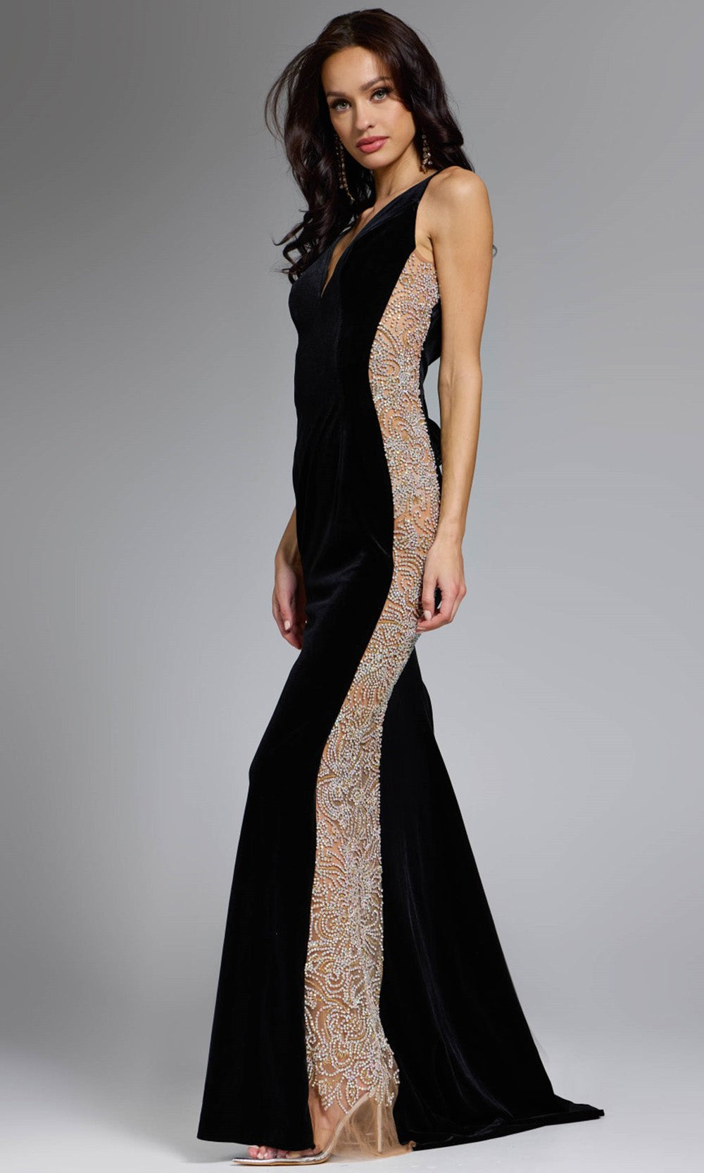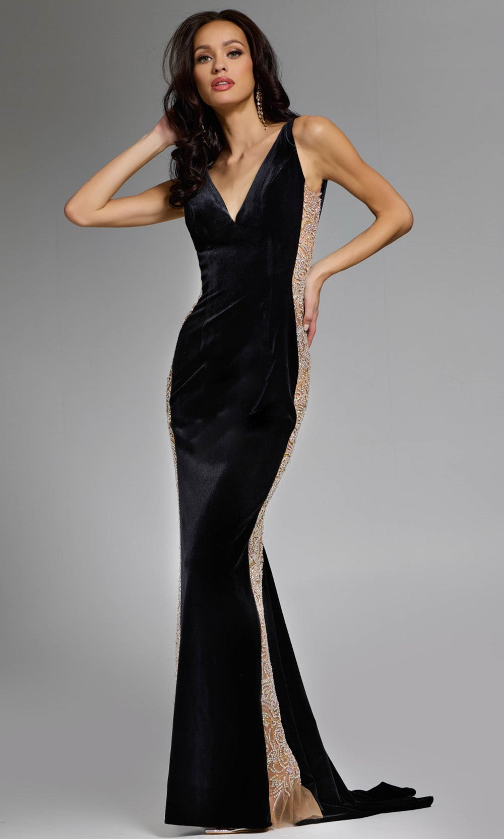 Striking design meets masterful contouring in this Jovani 42026 velvet dress that radiates quiet confidence. The deep v-neckline adds dramatic shape, balanced by beaded illusion sides that bring depth and texture to the silhouette. Every curve is accentuated through refined tailoring, creating an elongated effect that flatters from all angles. The floor-length sheath skirt extends into a soft train, adding fluid movement as you walk. Jovani 42026 redefines elegance through intricate contrast, merging strength and softness with effortless style. Model is wearing Black color.