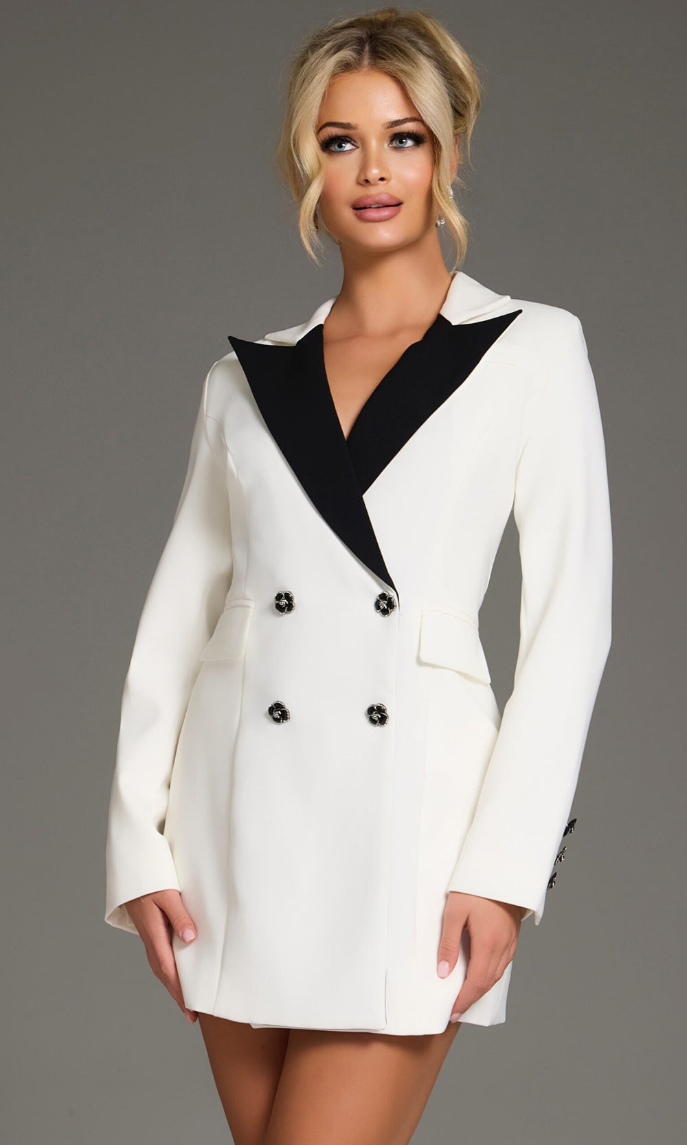 Commanding attention with structured sophistication, the Jovani 42124 short dress delivers striking contrast and a tailored silhouette. The crisp woven fabric highlights the tuxedo-inspired elements, including a contrast collar and double-breasted design. With a strong V-neckline, long sleeves and precise tailoring, this piece blends feminine edge and modern structure. Decorative floral buttons and flap pockets complete the look with a fashion-forward statement. Perfect for upscale evenings or chic daytime occasions, the Jovani 42124 offers polished style with confident flair. Model is wearing White/Black color.
