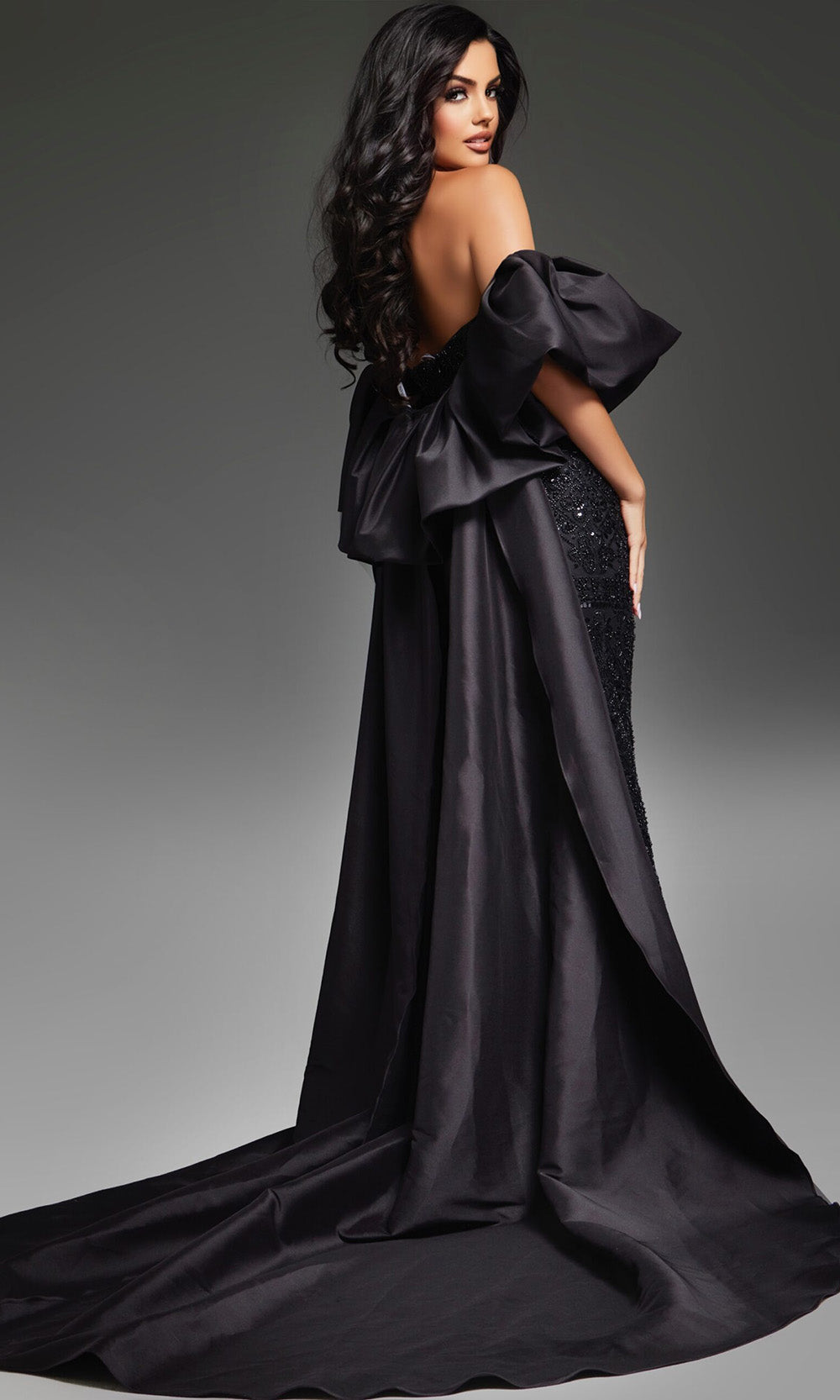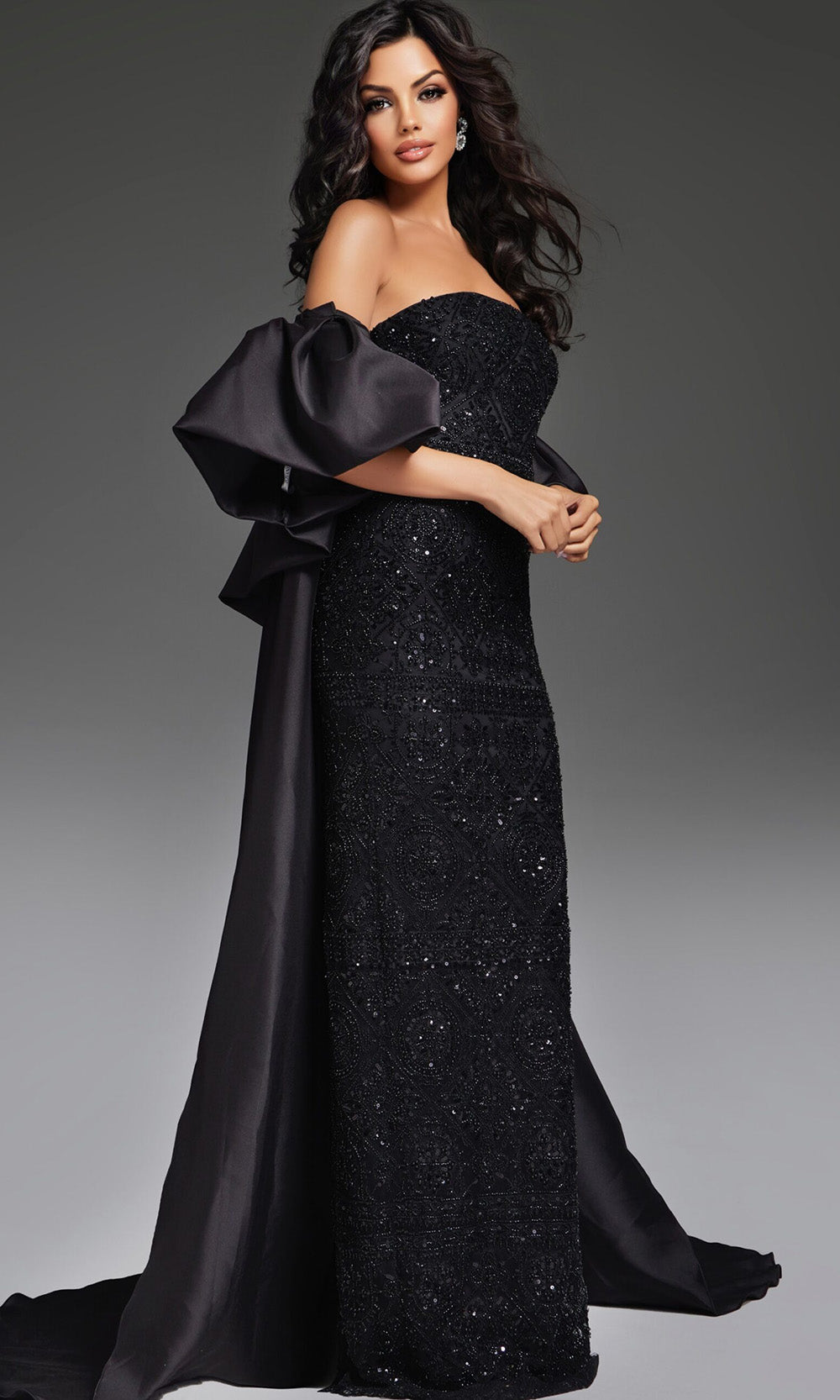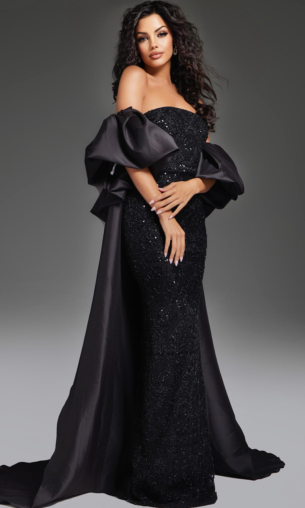 An aura of sophistication surrounds this Jovani 42137 evening gown, offering a striking presence with its sleek form and dramatic flourish. The strapless design brings attention to the intricately beaded pattern that enhances its streamlined shape, creating a glamorous effect. The straight across neckline flatters the shoulders and collarbone, while a detachable cape provides versatility and a regal touch. With its fitted sheath silhouette, this gown celebrates modern elegance, enhanced by a sweeping train that moves gracefully with each step. The Jovani 42137 ensures a memorable appearance with timeless appeal. Model is wearing Black color.