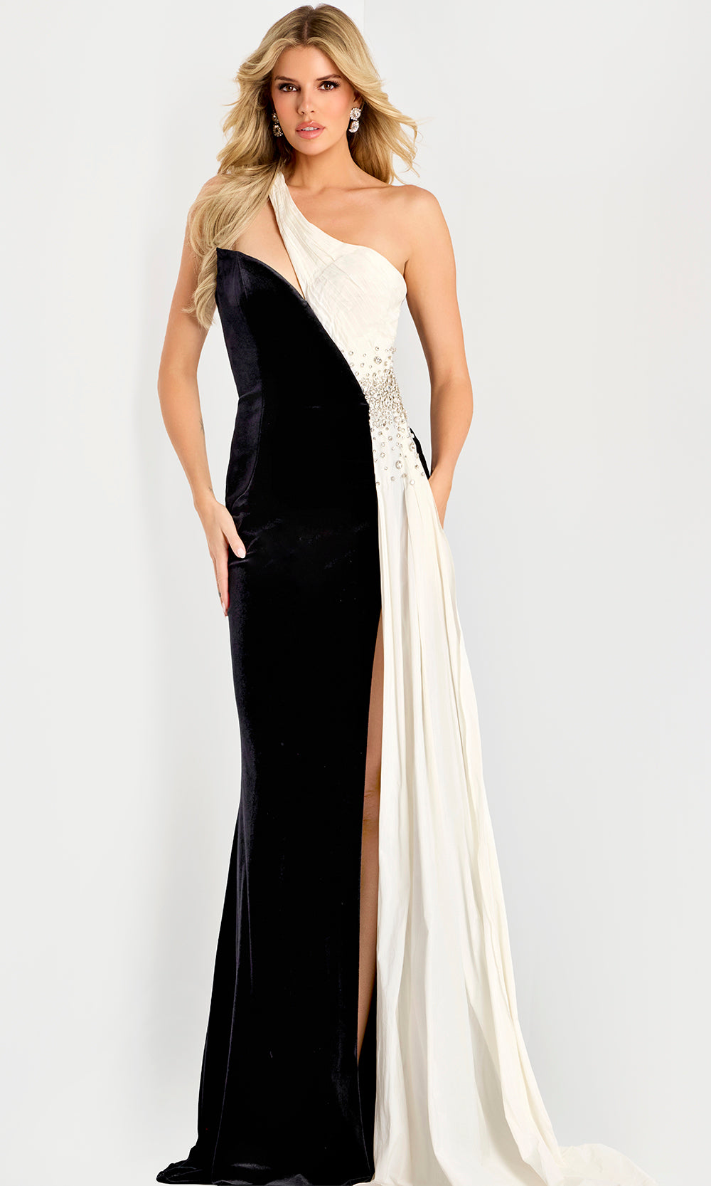 Jovani 42140 reimagines evening glamour with bold contrast and confident energy. A sleeveless one-shoulder neckline creates a striking focal point, enhanced by beaded detailing that accentuates the side waist. A flowing drape panel cascades from the shoulder to the floor, creating dimension and movement. The daring high slit enhances the leg line, adding allure without excess. Jovani 42140 sheath gown is made to captivate at red-carpet occasions and upscale celebrations. Model is wearing Black/White color.