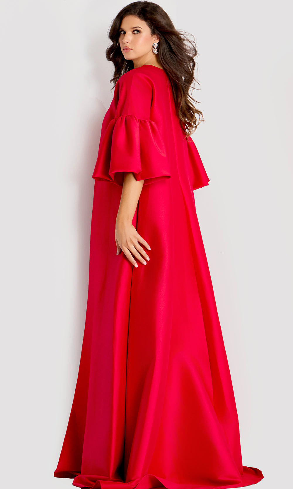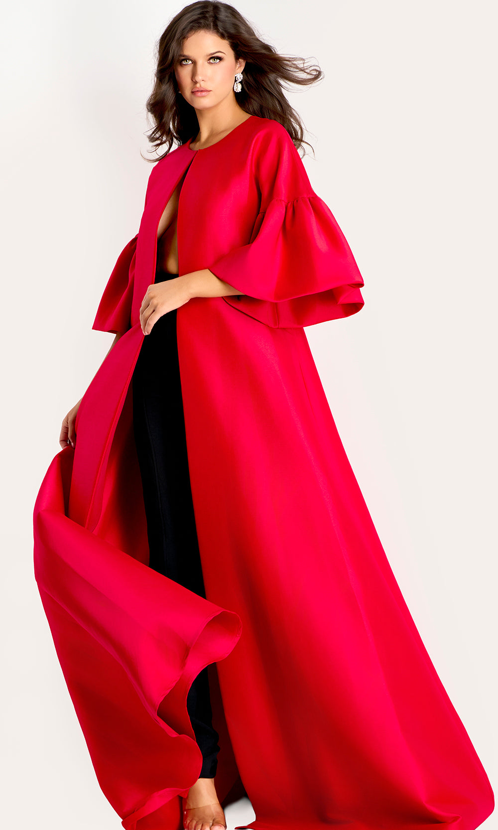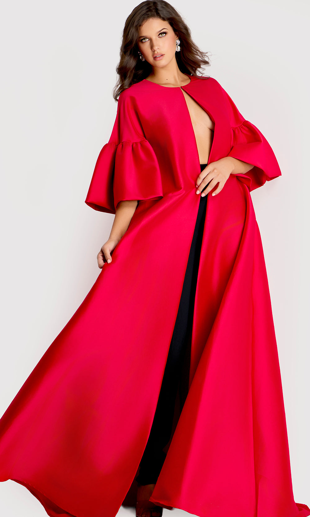 Evening fashion takes on a bold new expression with the Jovani 42160 gown, offering a presence designed to stand out in refined settings. Once worn, the gown reveals a dramatic cape overlay that moves with a commanding sweep, paired with voluminous bell sleeves that add sculptural dimension. Beneath the flowing structure is a fitted inner bodice that anchors the silhouette with clean shaping. The long A-line skirt enhances the overall sense of movement, creating a fluid profile at every step. Jovani 42160 offers a memorable option for galas, red carpet events, and upscale celebrations. Model is wearing Red color.