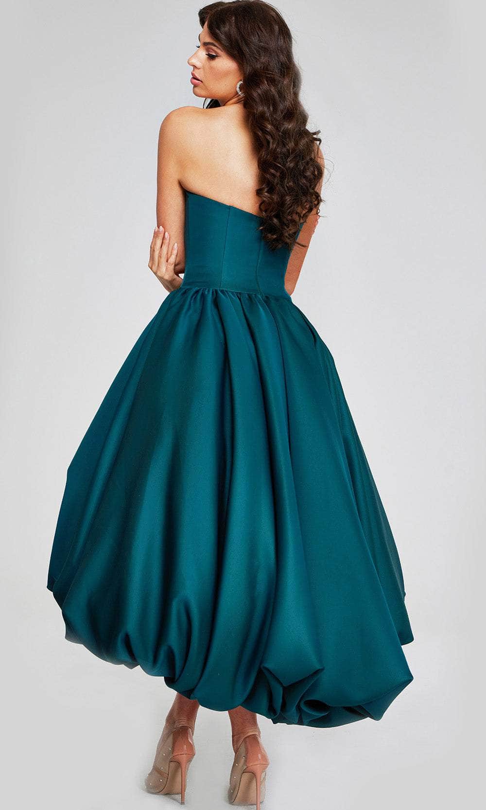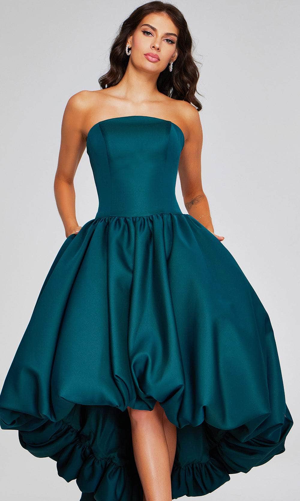 Discover the enchantment of this captivating Jovani 42345 dress. This strapless design features a plain bodice with an alluring straight across neckline and mid-open back. It has a zipper closure in the back to keep the dress in place and secure. With gathered details on the waist, the skirt flares a ballgown silhouette and highlights the whimsy touch of the bubble hemline. Completed in a high-low length that exudes glamour and convenient pockets. Make a moment truly special in this masterpiece from Jovani 42345. Model is wearing Dark Green color.