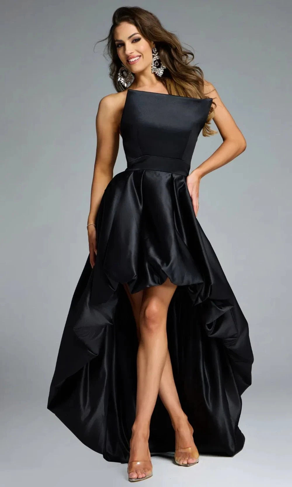 Step into high fashion with the Jovani 42357, a dramatic high low gown crafted for bold sophistication. Featuring an asymmetrical neckline and structured bodice, this strapless style exudes architectural elegance. A voluminous bubble hem completes the A-line skirt, infusing it with movement and eye-catching appeal. Perfect for upscale events or modern formal wear moments, this silhouette blends edge and grace seamlessly. The Jovani 42357 is an eye-catching statement piece that celebrates contemporary couture. Model is wearing Black color.