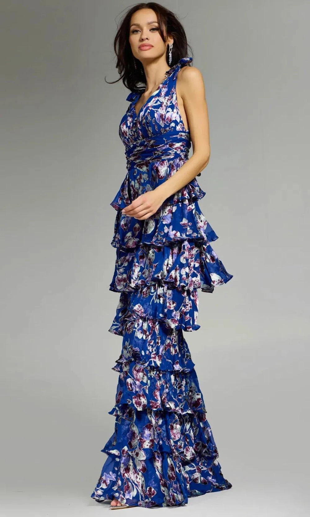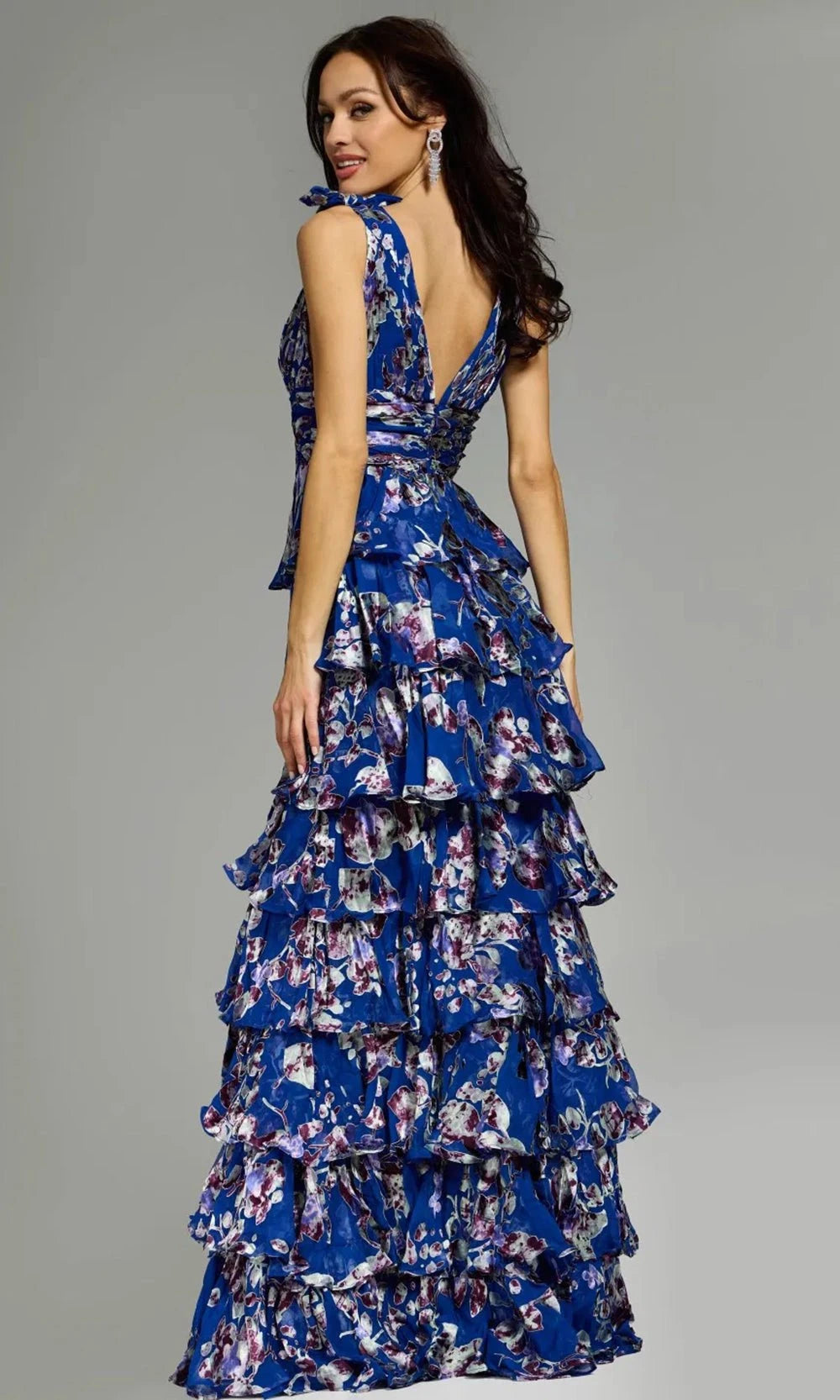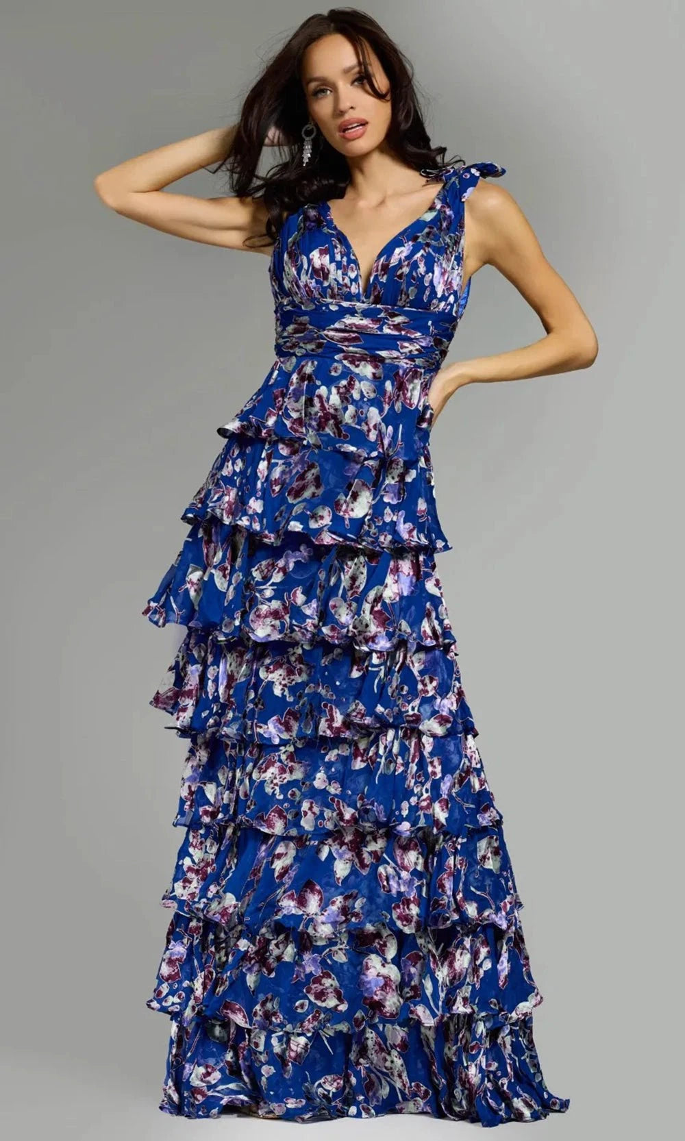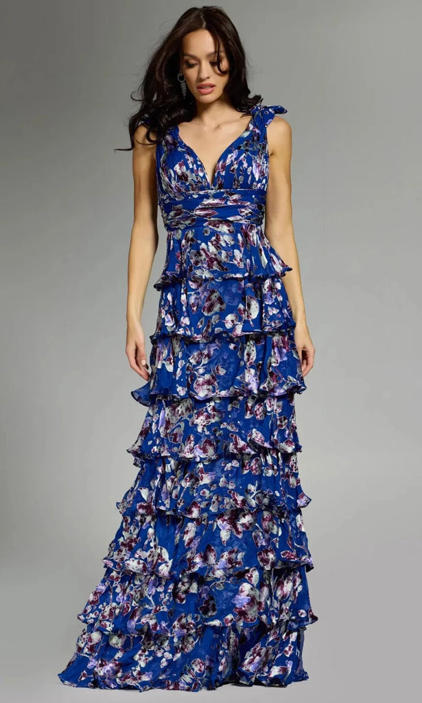 Embrace the playful spirit of modern romance in this Jovani 42381 gown. With its vivid floral print design and cascading layers, this A-line style features a deep V-neckline supported by feminine shoulder ties, adding both charm and comfort. The gown is defined by its multi-tiered ruffled skirt, which creates fluid movement with every step and enhances the visual appeal. A ruched waistband provides flattering structure, giving way to a sweeping long hem. Perfect for garden weddings or formal evenings, the Jovani 42381 is an expressive style statement for special occasions. Model is wearing Blue/Multi color.