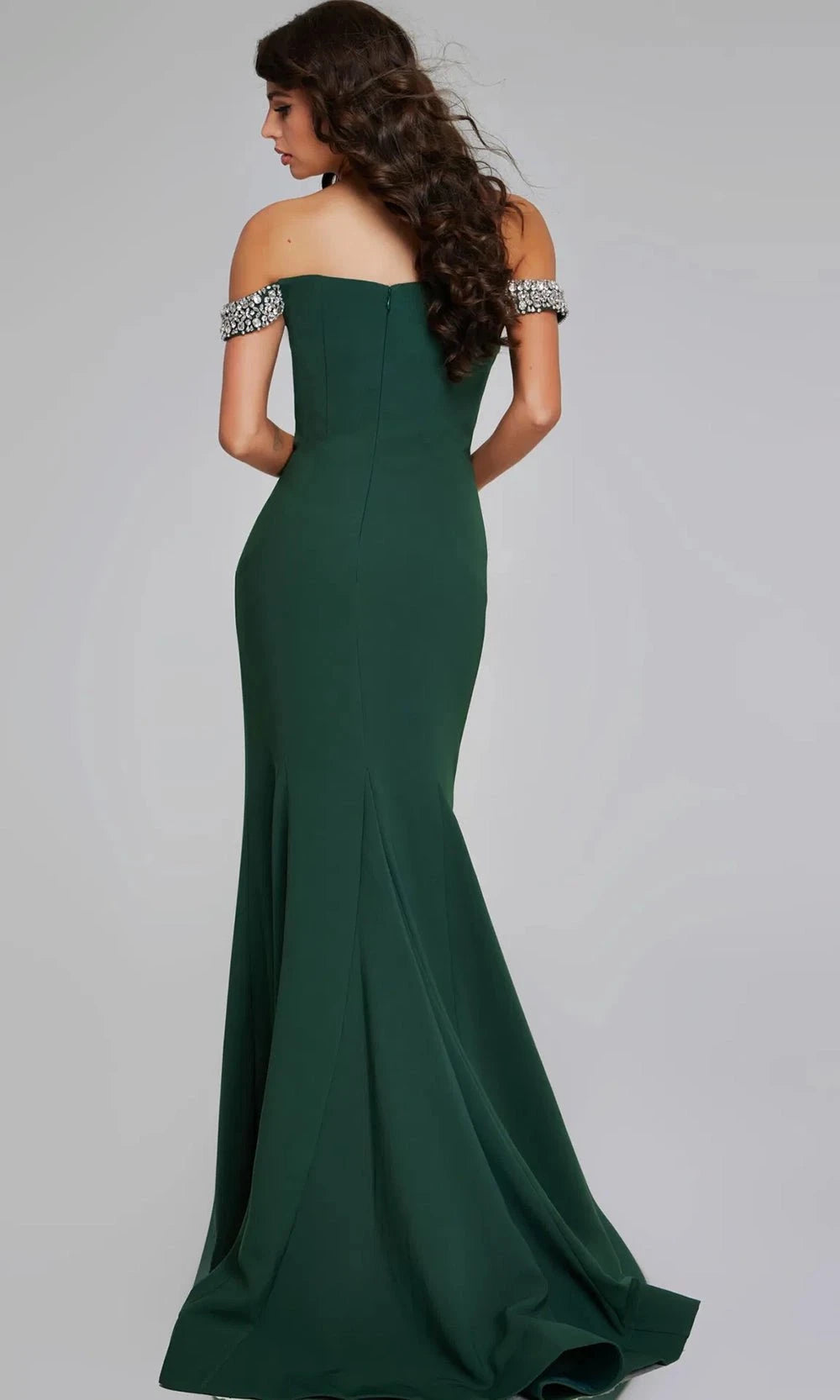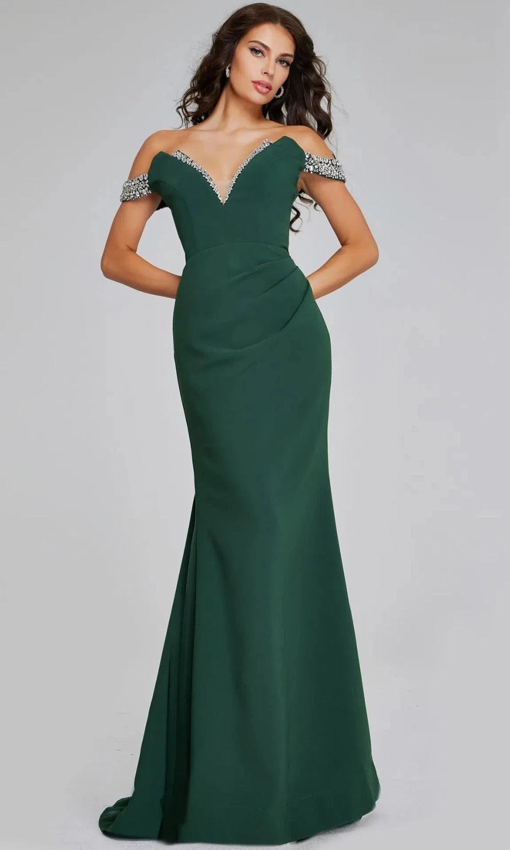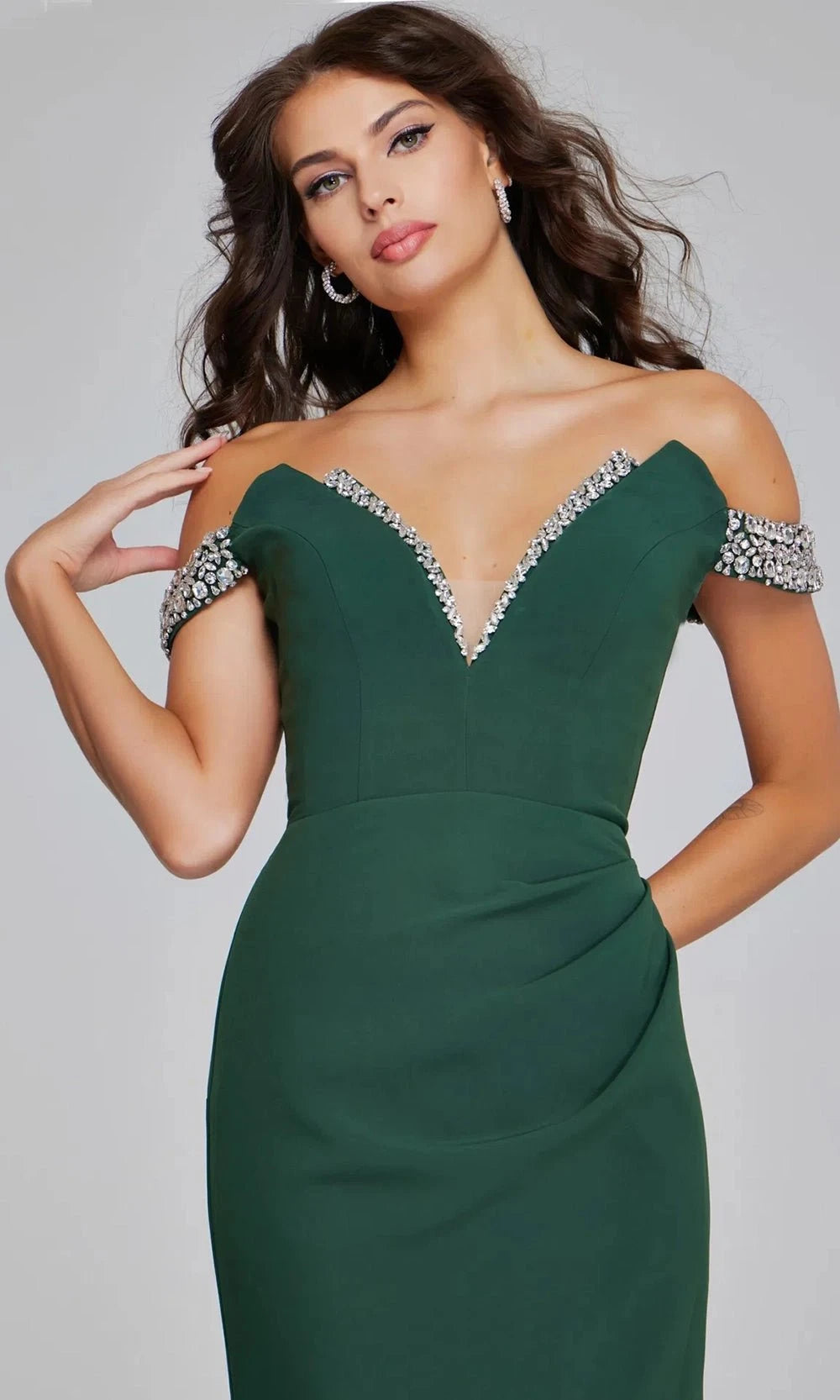 Elevate your evening look with the sophisticated Jovani 42394, a gown that radiates timeless allure. This off shoulder style features a v-neckline trimmed with intricate beadwork, drawing attention to the decolletage. Soft ruching enhances the bodice, creating a sculpted fit that flatters the figure, while the long sheath silhouette adds drama and elegance. The smooth back zipper allows for easy wear, making this gown both stunning and practical. Whether attending a gala or a formal celebration, the Jovani 42394 ensures a show-stopping entrance and lasting impression. Model is wearing Hunter color.