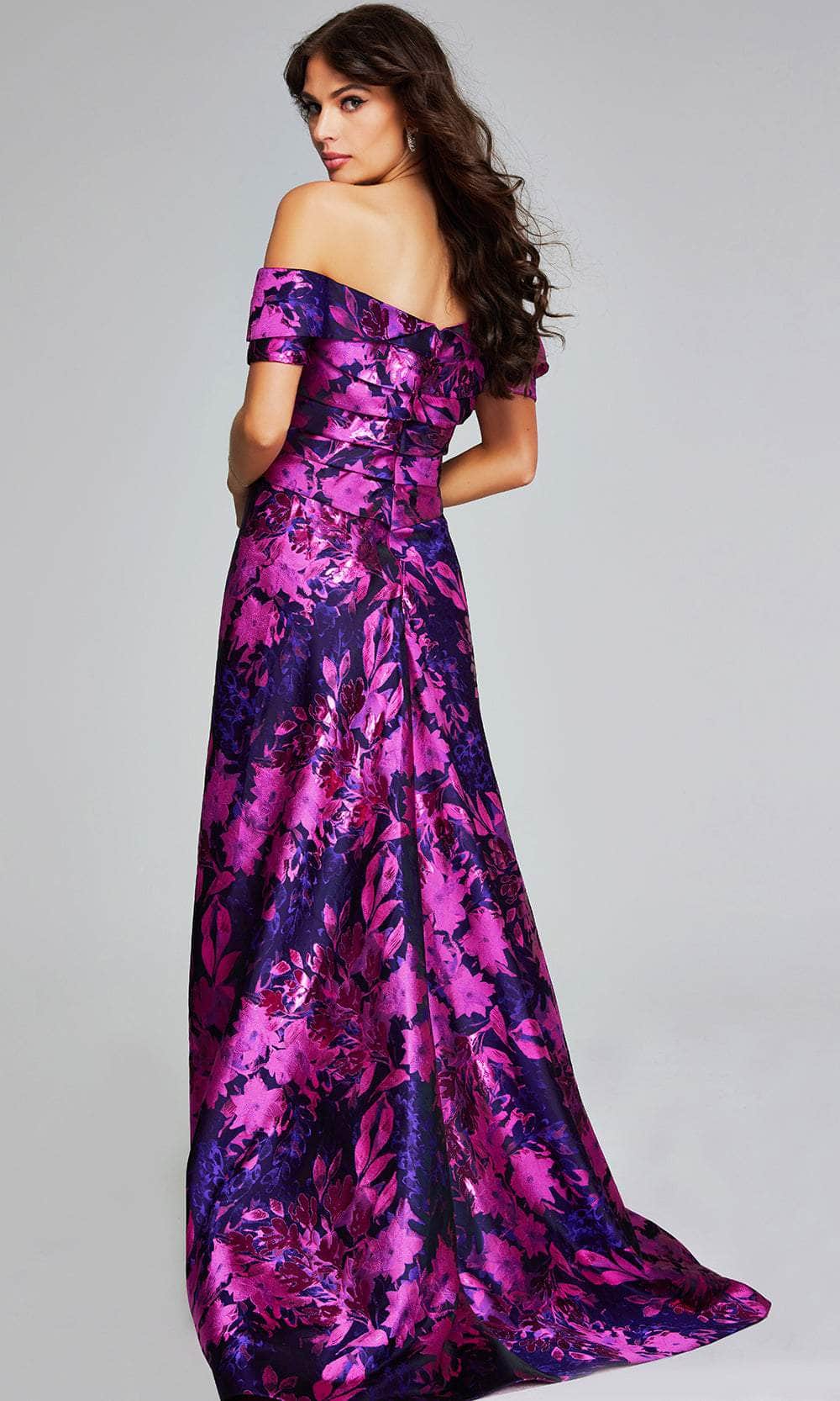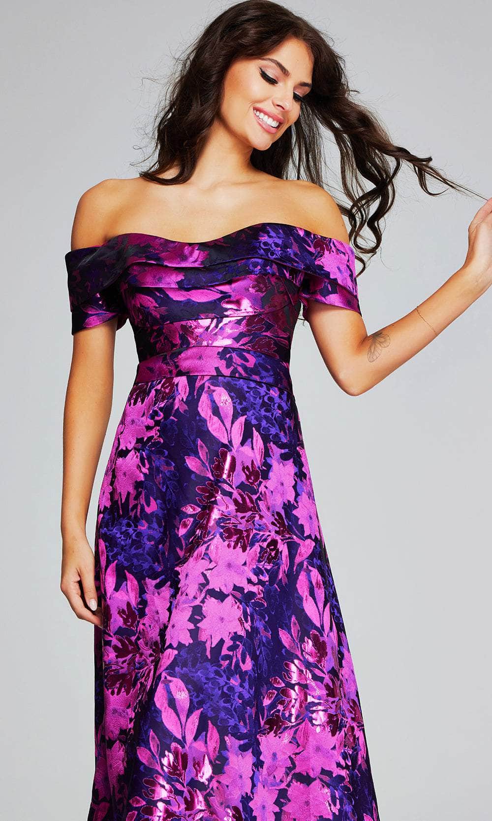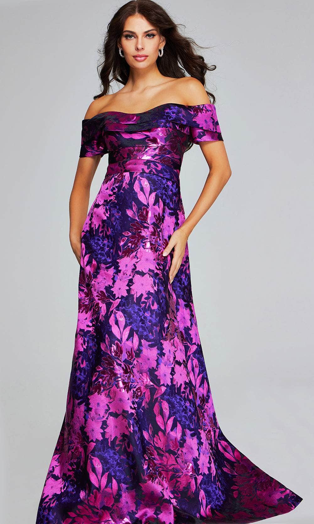 Capture the attention of everyone at your special event with the Jovani 42506 gown, a stunning representation of modern elegance. This exquisite dress is tailored from floral-printed fabric and features an off-shoulder bodice with pleated details, radiating contemporary sophistication. Secured with a center zipper closure at the back, the gown ensures a flawless fit. The floor-length skirt flows in an A-line silhouette, beautifully accentuating your figure. Perfect for any formal occasion, the Jovani 42506 effortlessly combines timeless elegance with a touch of modern flair, making it an exceptional choice for a memorable impression. Model is wearing Fuchsia/Purple color.