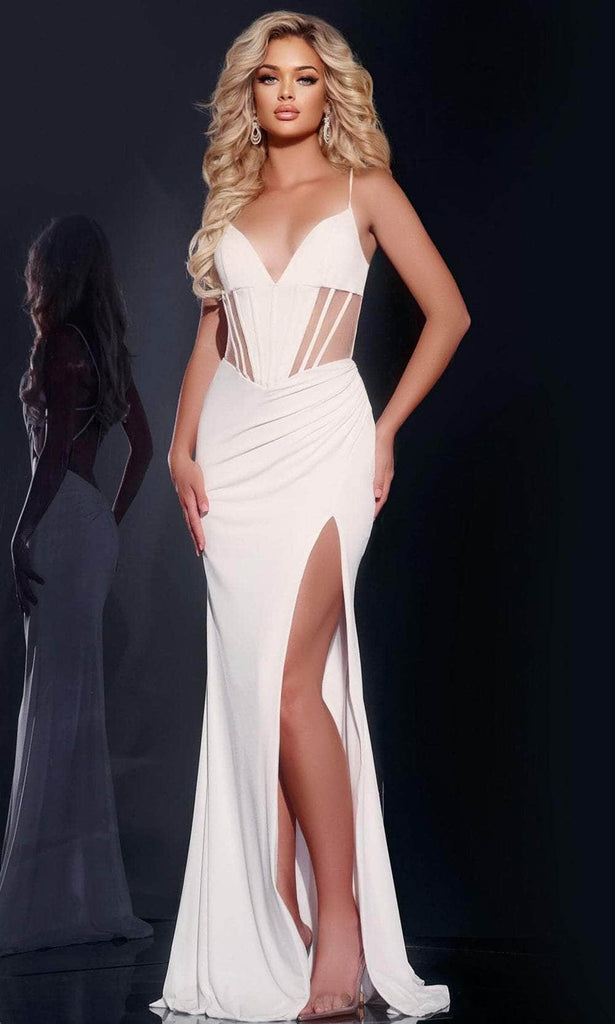 Step into sophistication with this Jovani 42534 prom dress, a sheer corset dress that’s equal parts refined and bold. This sleeveless design highlights a sleek, fitted bodice with sheer sides and a striking open back with intricate straps. The floor-length sheath skirt features a high slit and a subtle train, making this dress a beautiful choice for an elegant event. Embrace timeless glamour with this Jovani 42534 prom dress. Model is wearing the Off White color.