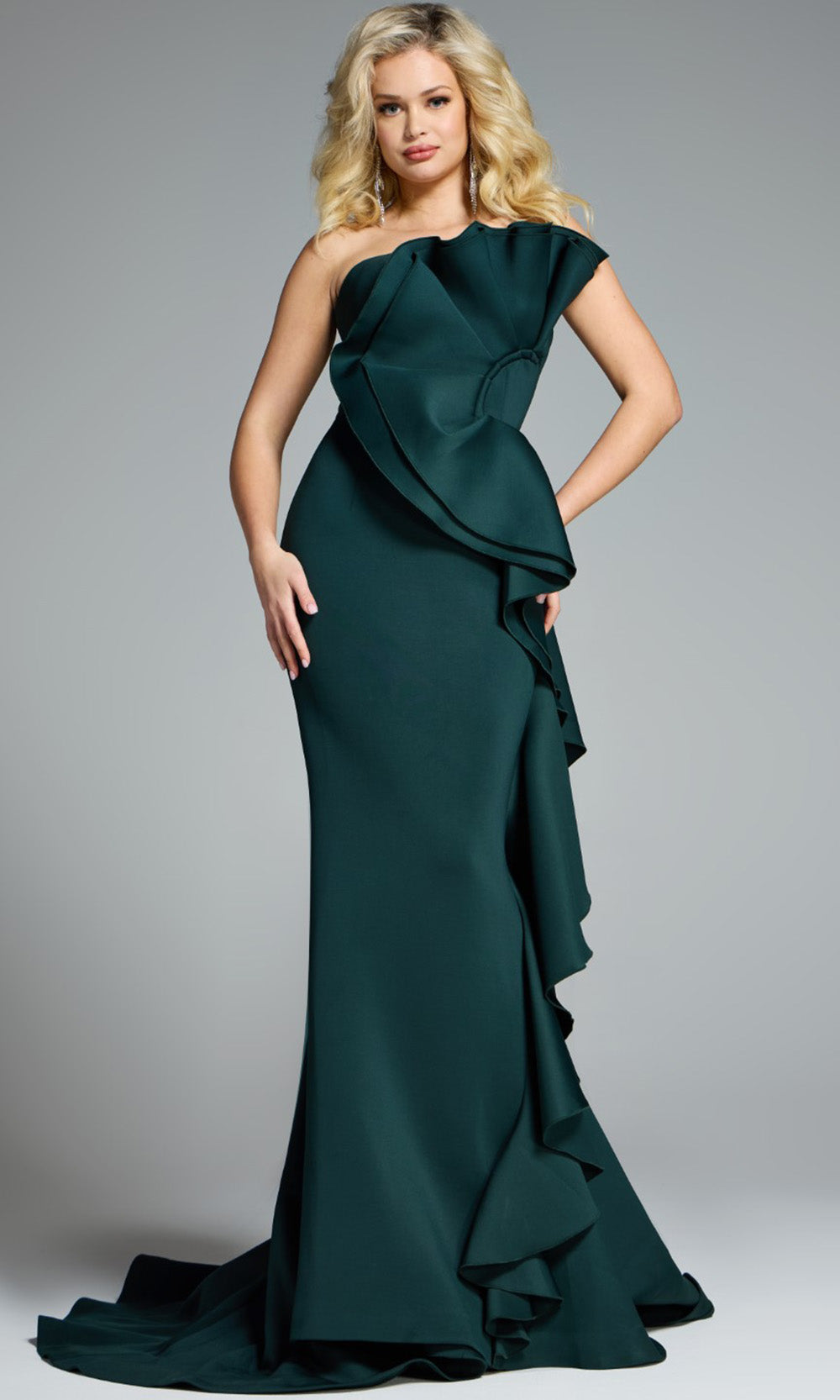 Make an unforgettable entrance in this Jovani 42543 strapless satin gown that blends classic elegance with dramatic detailing. The asymmetric neckline enhances the decolletage, while the fitted bodice sculpts the figure for a refined silhouette. A cascading ruffle runs the length of the mermaid skirt, adding depth and movement before finishing in a dramatic train that sweeps the floor. Wearing the Jovani 42543 means carrying a sense of confidence and allure that is unmatched, ensuring you remain the focal point of any occasion. Models are wearing Black, and Hunter colors.