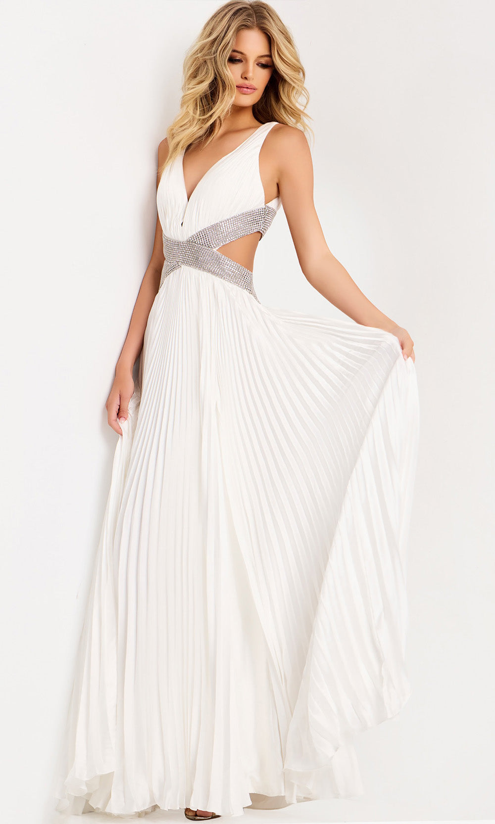 Soft movement and graceful shaping come together in Jovani 42811 for a refined evening presentation. This gown features a plunging V neckline that draws attention upward while framing the bodice beautifully. The waist is highlighted by a beaded band that creates contrast against the flowing pleated skirt. Open side details introduce dimension without overpowering the overall look. The long hemline allows the A-line skirt to glide effortlessly with motion. Jovani 42811 offers a balanced design that feels light, elegant, and visually captivating from every angle. Model is wearing Off-White color.