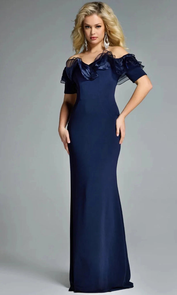Elegance takes a contemporary turn with this striking off-shoulder gown, the Jovani 42966. Designed with a fitted bodice and natural waist, this gown gracefully falls into a sleek column silhouette. Its standout feature is the structured off-shoulder neckline trimmed with delicate ruffles, adding softness and sophistication. The clean, solid hue provides a versatile base for accessorizing, making it ideal for a wide range of formal events. Jovani 42966 is perfect for women seeking graceful confidence in a minimalist silhouette. Model is wearing Navy color.
