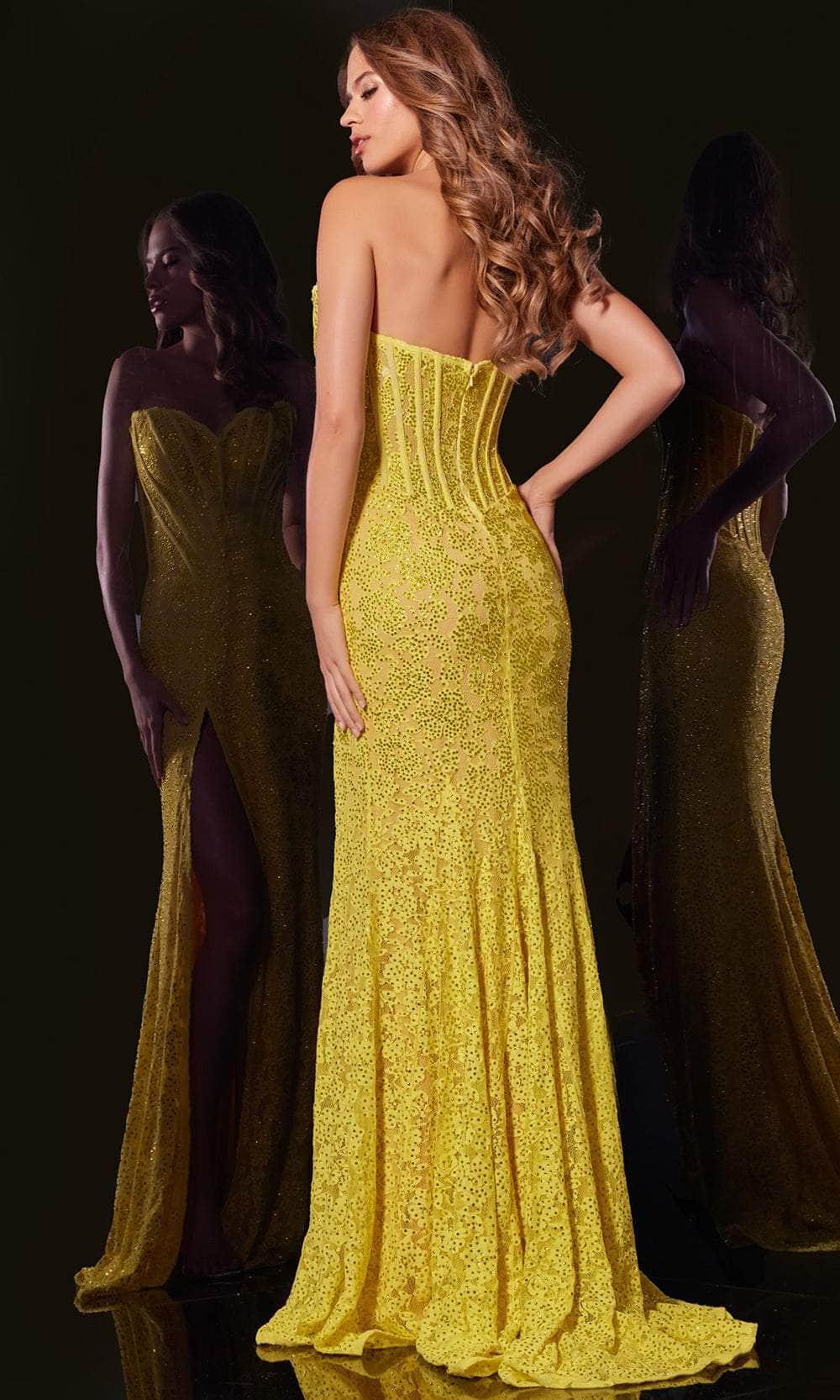 The Jovani 43093 gown is a showstopper, perfect for making an unforgettable entrance. With a luxurious floor-length silhouette, this dress features a sweetheart neckline and a strapless corset bodice that flatters the figure. The skirt flows effortlessly, accented by a daring high slit. Intricate lace appliques embellish the gown, enhancing its beauty, while the sweeping train adds a final touch of elegance. Step into any event with confidence and grace in the Jovani 43093 gown. Model is wearing the Yellow color.