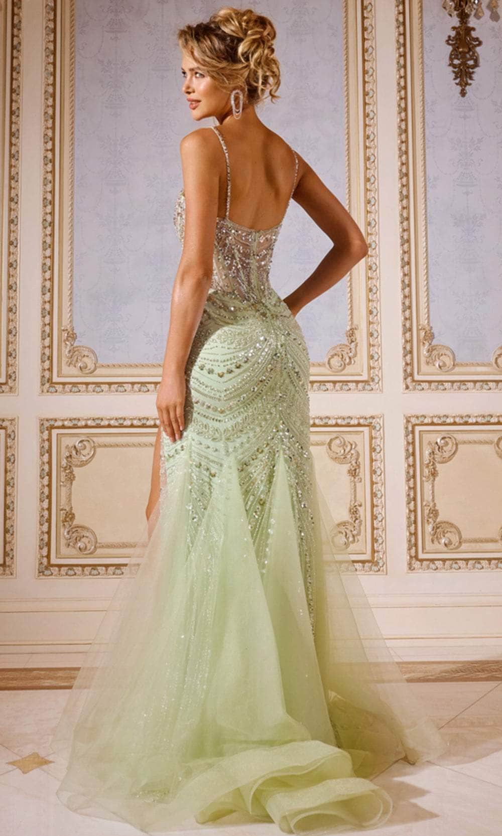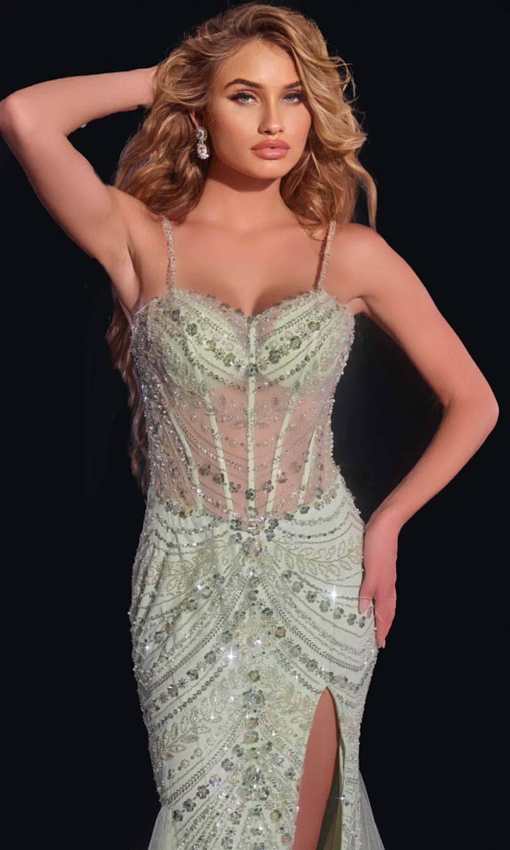 Embrace your inner goddess in this masterpiece from Jovani 43189. The sleeveless gown is intricately adorned with beadwork, while the sheer corset bodice is structured with boning for a stunning fit and accentuating your curves beautifully. Spaghetti straps gracefully support the plunging v-neckline and low open back. The front slit reveals just the right amount of leg, and the godets accentuate the mermaid skirt which creates movement and drama. Command attention on your special night by wearing the Jovani 43189 gown. Model is wearing Mint color.