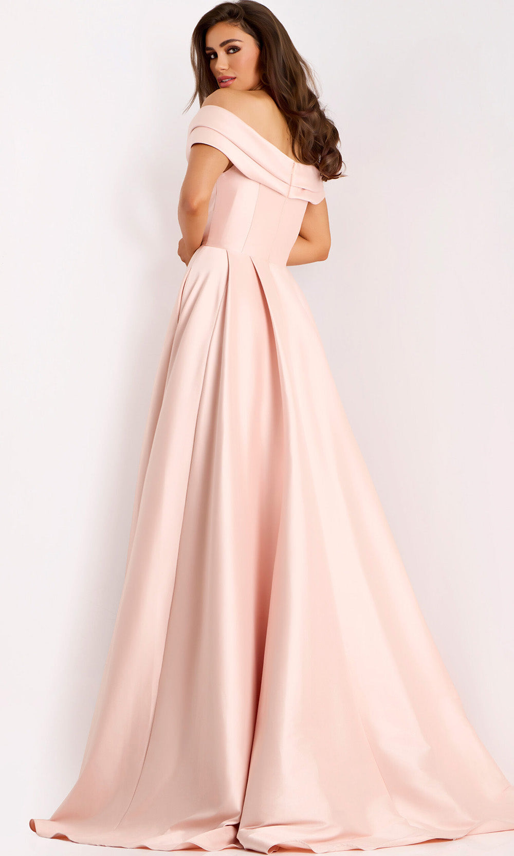 Elegance is redefined in Jovani 43279, offering a timeless silhouette for the most sophisticated events. The off shoulder sweetheart neckline features softly folded detailing, framing the shoulders with an architectural touch. A precisely tailored bodice highlights the natural waist before giving way to a flowing pleated A-line skirt that moves with ease. The full length hem extends the gown graceful effect, making it suitable for grand entrances. Jovani 43279 is an ideal option for those who value understated glamour with thoughtful design details that elevate the overall look. Model is wearing Blush color.
