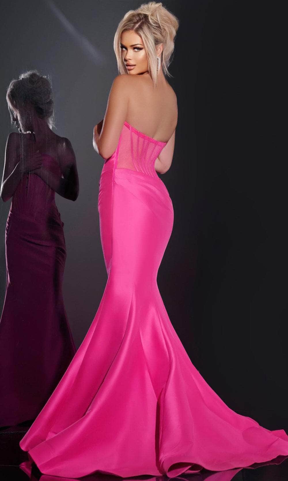 The Jovani 43350 prom dress combines elegance and drama effortlessly. Its sweetheart neckline and corset bodice accentuate the bust and waist, creating a flattering shape. The full-length skirt flows gracefully, and the strapless design draws attention to the shoulders. A sheer back panel adds a touch of allure, making this gown ideal for any glamorous event. With its refined silhouette, the Jovani 43350 prom dress is a stunning choice for those who want to make a statement at formal occasions, offering both sophistication and style. Model is wearing the Fuchsia color.