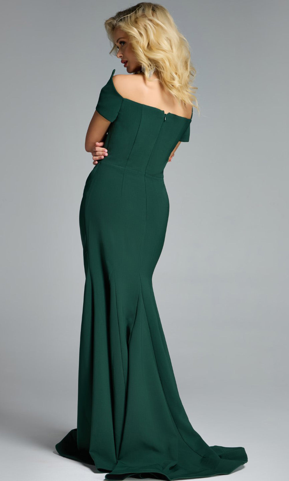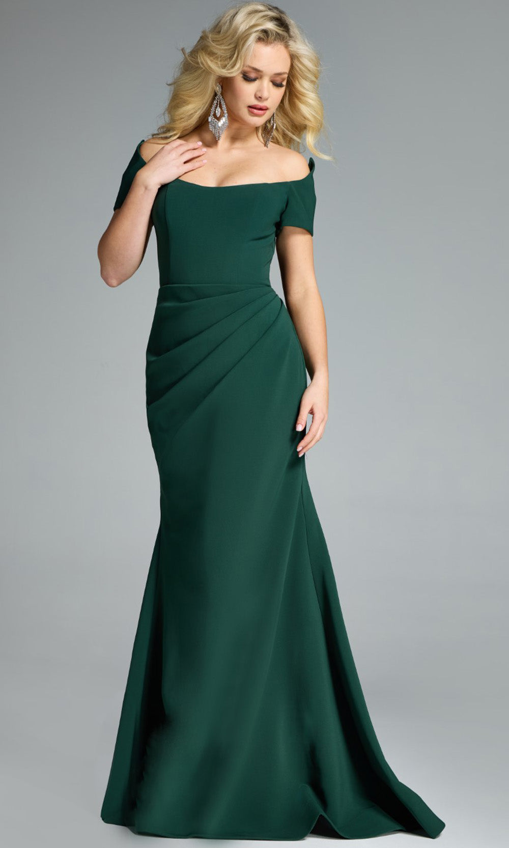 An aura of graceful sophistication surrounds the exquisite Jovani 43370. The short sleeves frame the off-shoulder neckline, while the ruched bodice is strategically tailored to flatter and define the waistline. The sleek mermaid silhouette flows elegantly to the floor, creating a refined and graceful profile from every angle. Designed for the woman who values timeless glamour with a modern sensibility, this gown promises captivating presence. From black tie events to grand celebrations, the Jovani 43370 will make each moment unforgettable with its poised design and flawless execution. Model is wearing Hunter color.