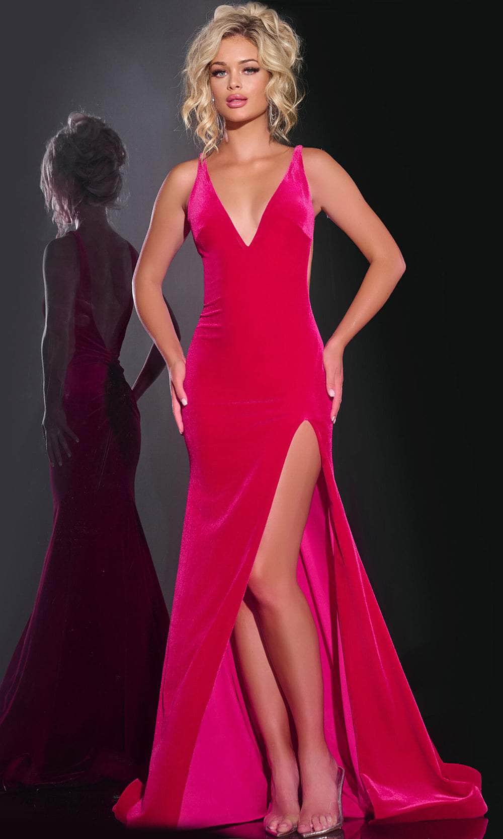 Unleash your pure elegance with this unforgettable velvet gown from Jovani 43578. This statuesque ensemble showcases wide straps that offer wonderful support for the plunging V-neckline and low V-shaped back. The illusion cutout detail in the side waist adds a hint of intrigue. Hugging every curve, the skirt sculpts a mermaid silhouette that flows into a dramatic sweeping train and is enhanced by a high slit that exudes confidence. This Jovani 43578 masterpiece guarantees all eyes on you. Model is wearing Fuchsia color.