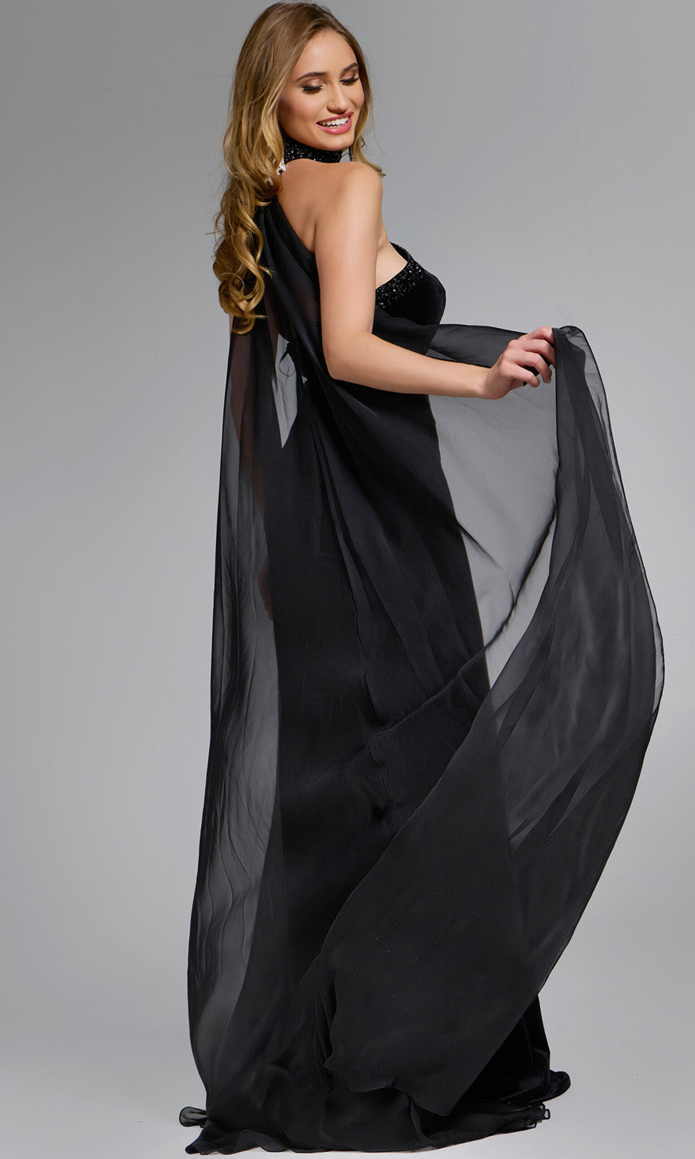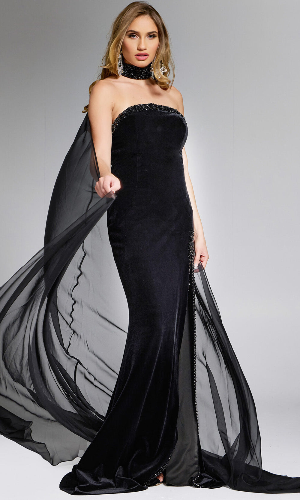 Delivering an aura of dramatic sophistication, this Jovani 43659 gown ensures a statement-making entrance. It showcases a strapless neckline adorned with beaded trim, perfectly paired with a coordinating choker for added allure. Its fitted sheath silhouette is enhanced by flowing sheer cape that create captivating movement. A daring high slit balances elegance with a hint of flair. With its sumptuous velvet fabric and refined detailing, the Jovani 43659 embodies luxury and individuality in equal measure. Model is wearing Black color.