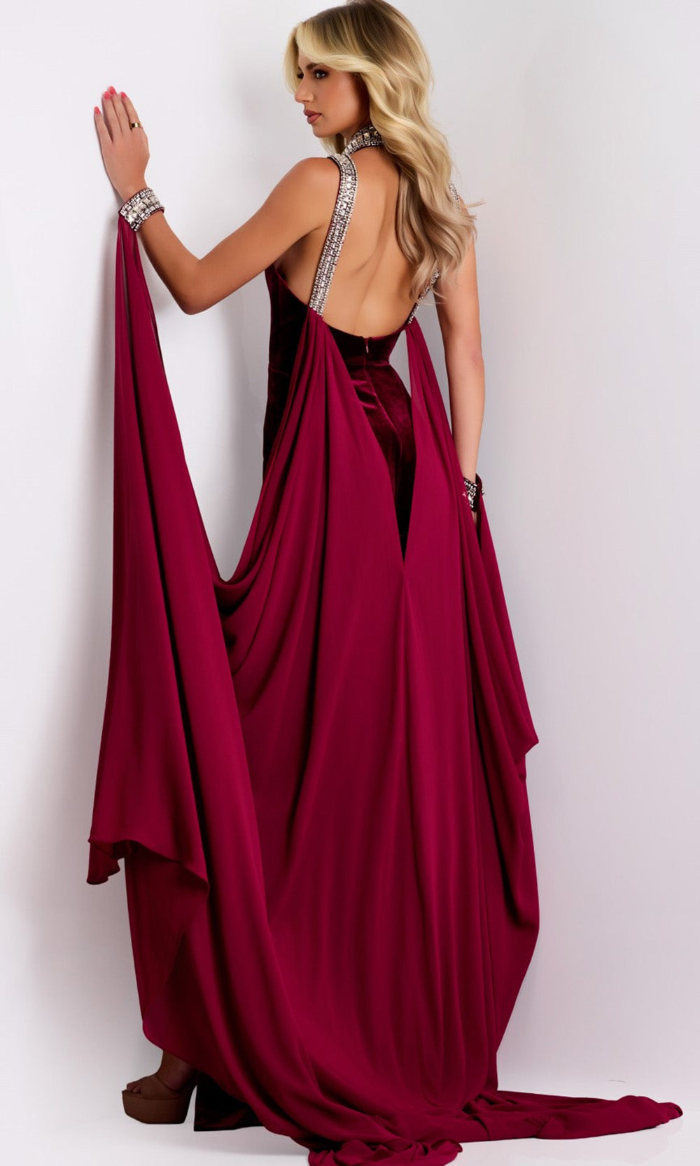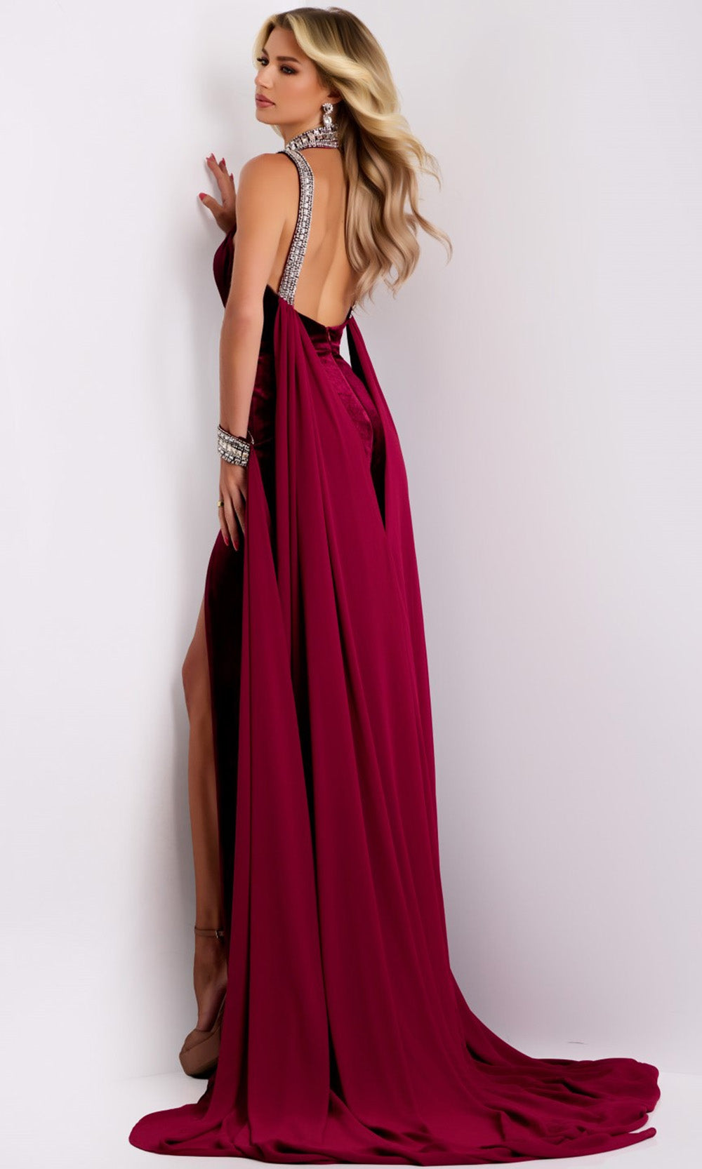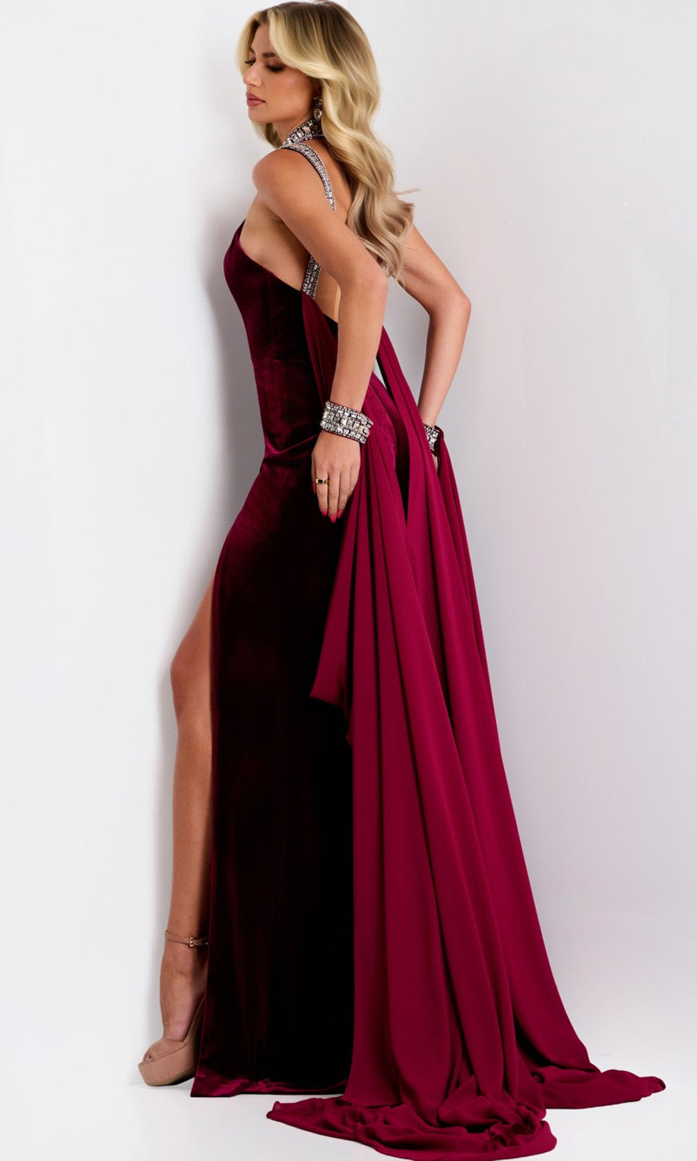 Commanding beauty and luxurious texture make the Jovani 43699 a gown that stands apart in any setting. The halter neckline adorned with shimmering jewels draws attention to the shoulders, creating a striking frame. Velvet fabric enriches the gown with depth and tone, complemented by a flowing chiffon overlay that trails behind gracefully. A thigh-high slit introduces dynamic motion and visual intrigue with every step. The sheath skirt enhances presence without excess detail, keeping focus on the rich texture and jeweled accents. For an evening filled with unforgettable moments, the Jovani 43699 delivers dramatic sophistication with a flawless finish. Model is wearing Burgundy color.