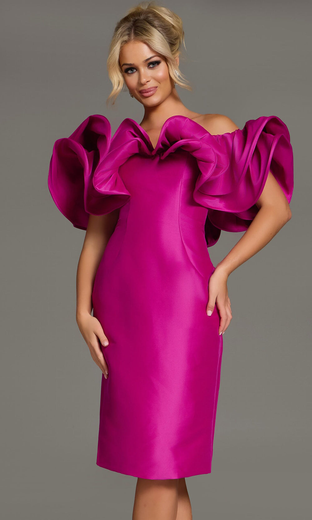 For those who love high drama and sculptural detail, Jovani 43758 is a remarkable choice. Massive ruffles sweep across the off-shoulder neckline and shoulders, commanding attention without sacrificing grace. A sleek sheath skirt and contoured bodice bring balance, creating a look that is both structured and expressive. Whether viewed head-on or in profile, the knee-length dress evokes sophistication with a daring twist. Let Jovani 43758 style redefine your signature style with bold yet refined femininity. Model is wearing Fuchsia color.