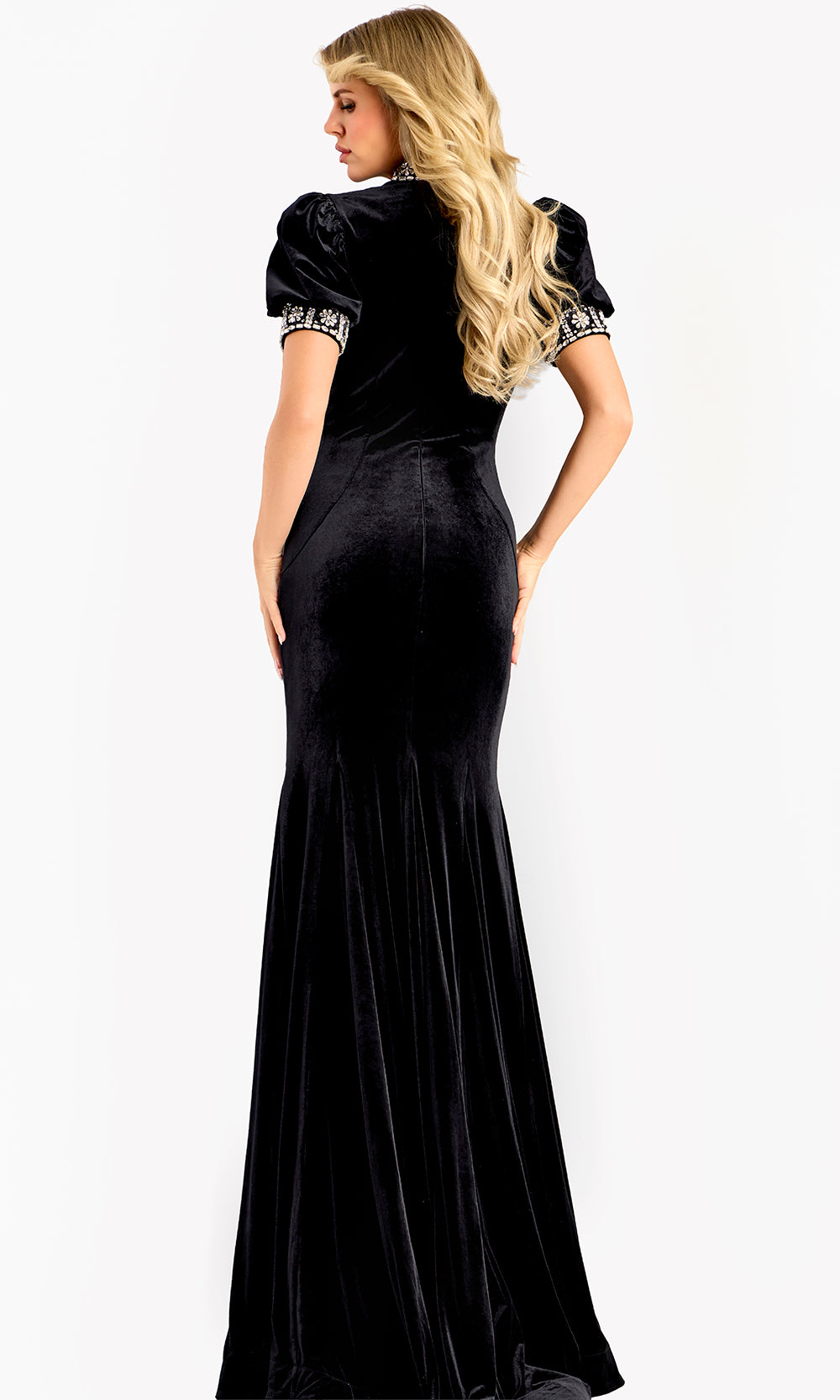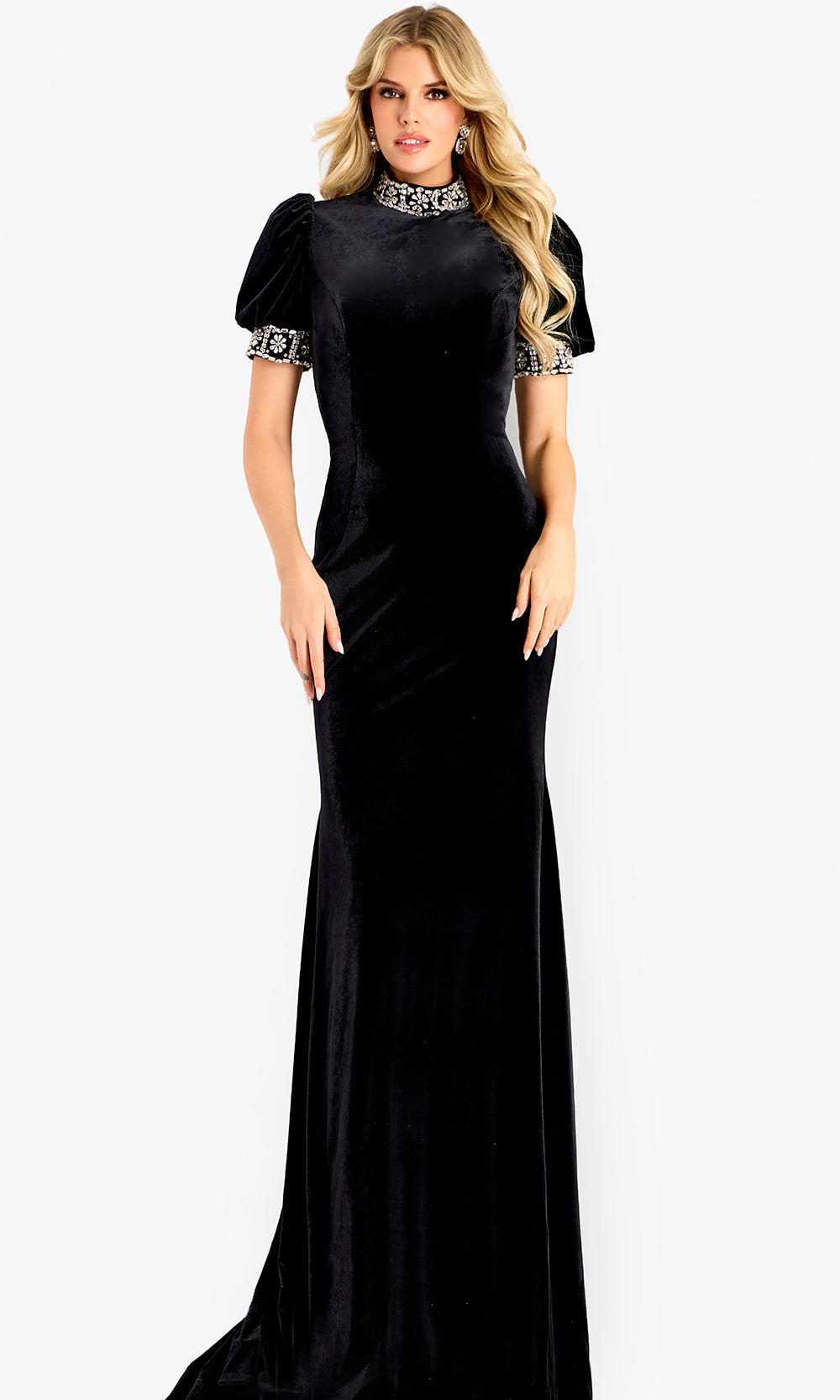 A refined and confident choice for polished evening dressing, the Jovani 43771 style delivers elegance with a touch of architectural appeal. Its high neckline creates a regal profile that transitions into short puff sleeves accented with sparkling rhinestones. The fitted bodice and column skirt follow the natural line of the body, offering a sleek and poised silhouette that moves gracefully throughout every formal moment. Ideal for charity galas, formal dinners, and elevated events, this Jovani 43771 masterpiece combines classic tailoring with modern sophistication. Model is wearing Black color.