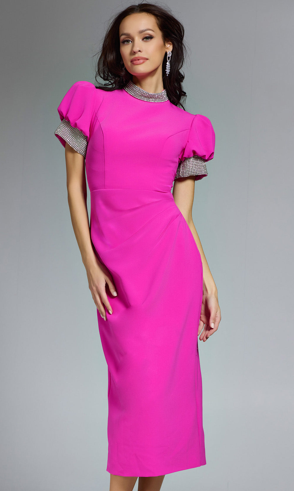 Modern elegance is reimagined in a Jovani 43773 dress that bridges polished style with subtle sparkle. The fitted ensemble is defined by its clean sheath silhouette, complemented by rhinestone-trimmed high neckline and cuffs. Short puff sleeves add a touch of softness, while the ruched waist creates gentle shaping. A tea-length skirt and back slit combine practicality with style, allowing comfortable movement. Ideal for cocktail receptions or semi-formal events, the Jovani 43773 offers a confident and refined appearance. Models are wearing Royal, and Valentino Pink colors.