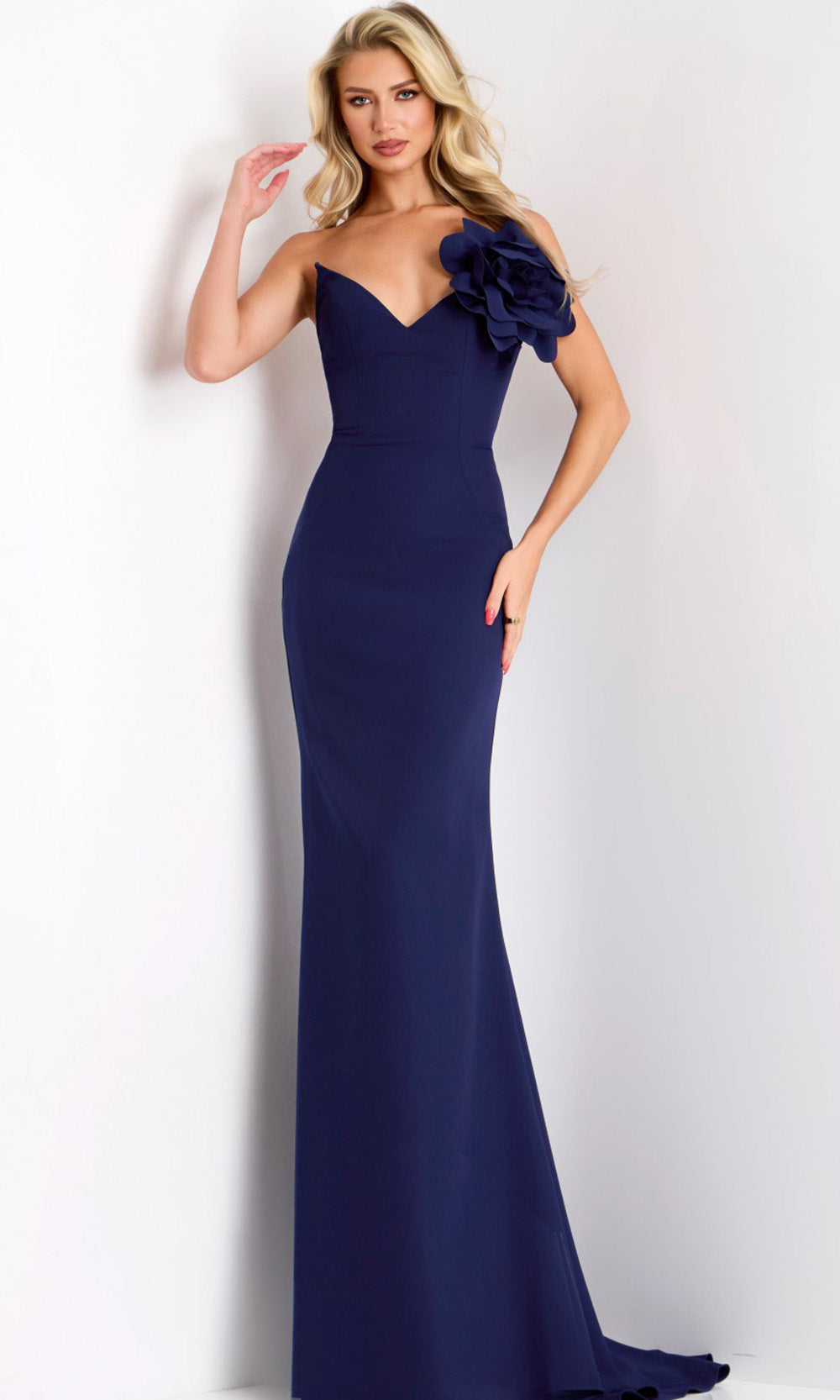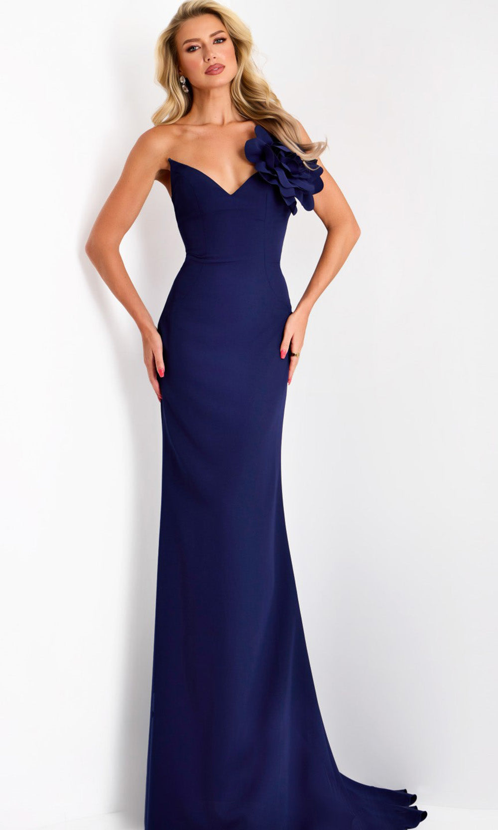 A captivating look unfolds with the sleek design of Jovani 43814, where modern elegance meets subtle drama. The fitted shape flatters from every angle, while a beautifully crafted floral accent adorns the single shoulder, adding a focal point of interest. Its floor-length sheath silhouette flows effortlessly, complemented by a refined sweep train. The deep v-neckline and minimal seams enhance the sophistication of this strapless piece, making it a timeless addition to any wardrobe. Jovani 43814 is the embodiment of understated glamour with a statement-making twist. Model is wearing Navy color.