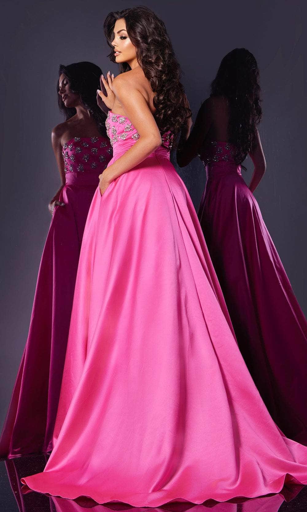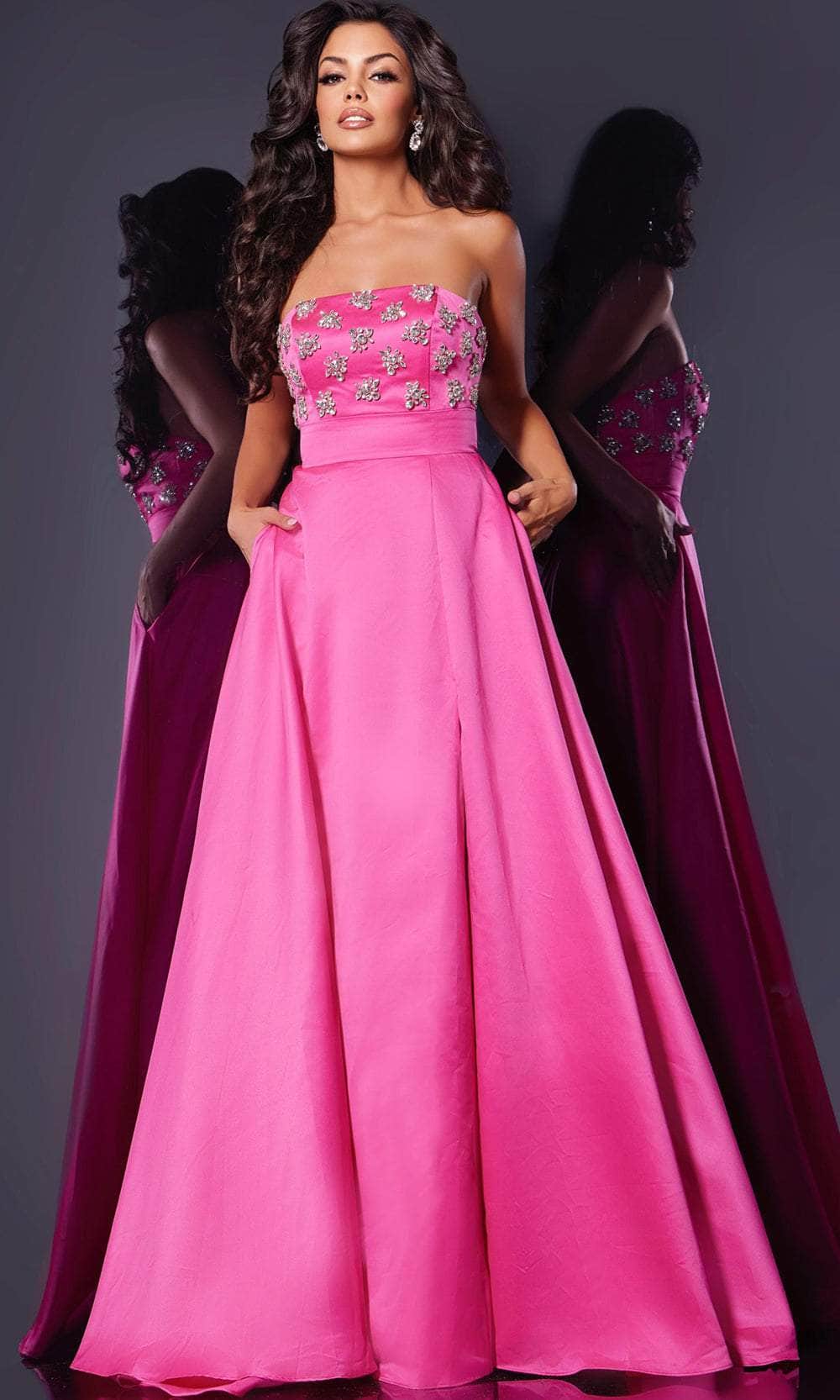 Step into the spotlight with the Jovani 43822. This exquisite gown features a strapless, fitted bodice adorned with sparkling rhinestones, creating a dazzling effect. The straight-across neckline offers a classic and elegant look, while the expertly crafted seams ensure a flawless fit. The floor-length skirt is a masterpiece in itself, accented with side pockets for a touch of modern practicality. A daring slit adds a hint of allure, and the gown ends with a graceful train that flows beautifully behind you. Perfect for any formal event, this Jovani 43822 guarantees to leave a lasting impression. Model is wearing Hot Pink color.