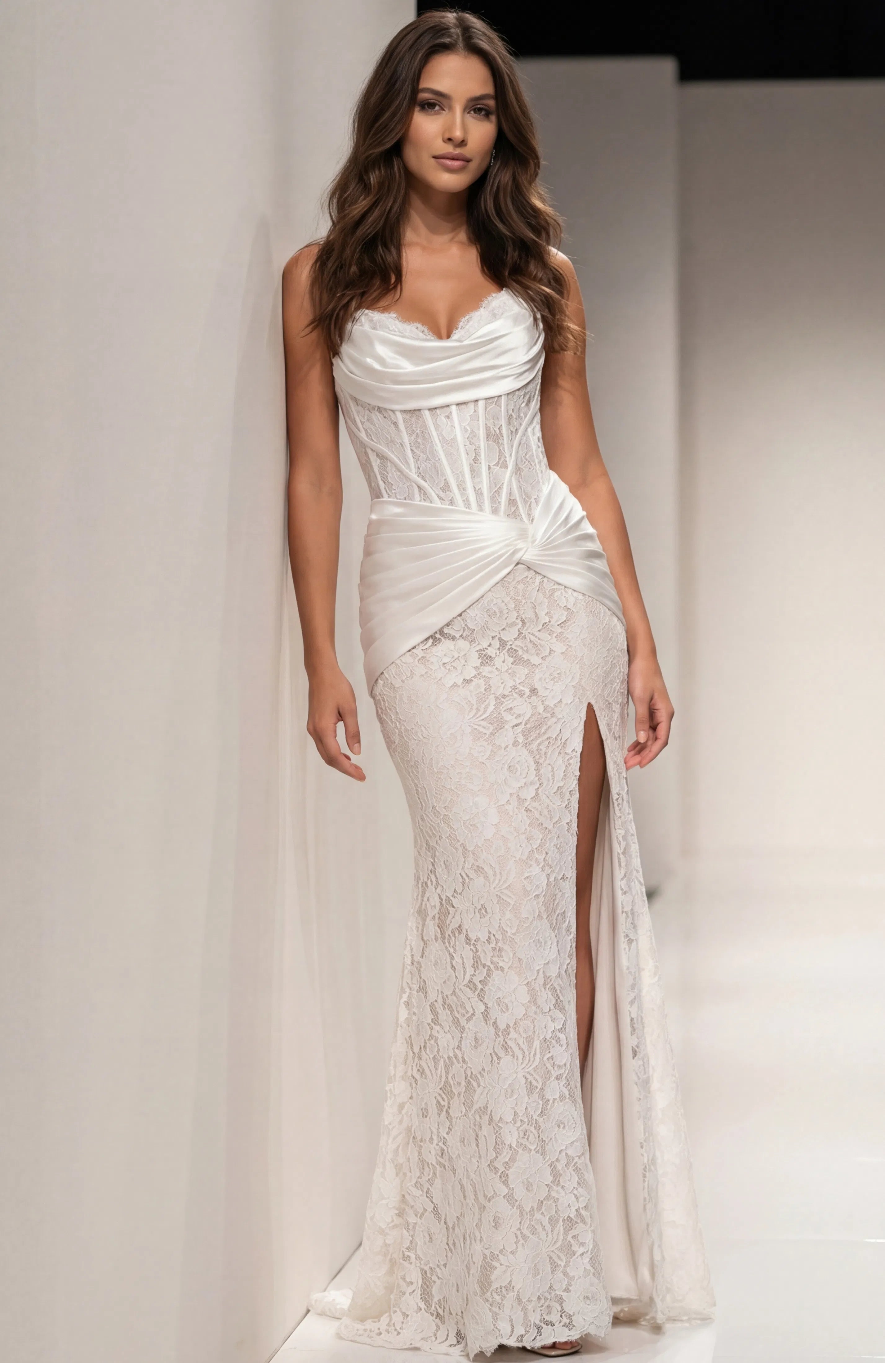| Details: | Strapless, Pleated Bodice, Corset Boning, Twist Accent Waist, High Slit, Sweep Train |