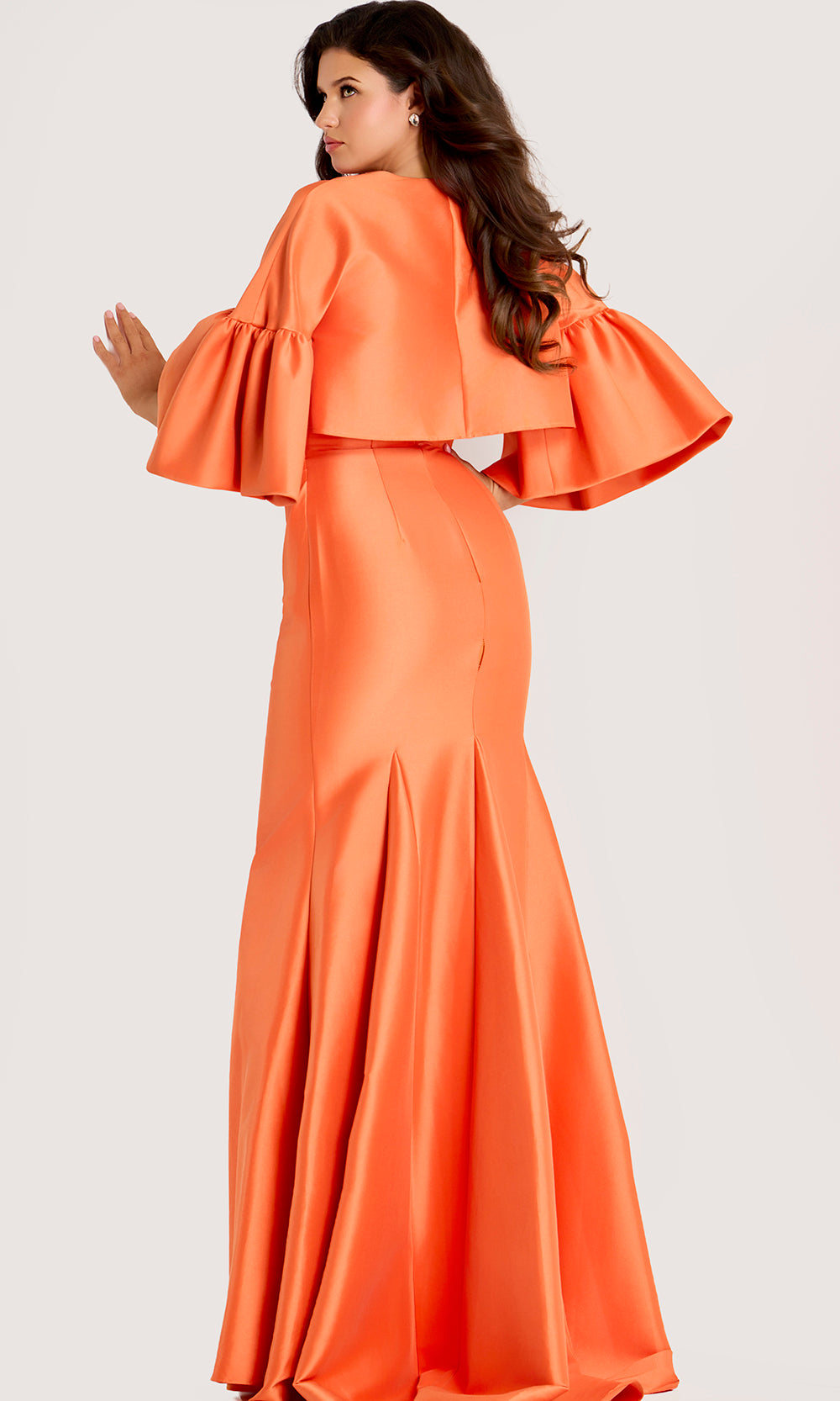 Confident glamour defines the visual impact of Jovani 44196 strapless gown, offering a look that feels poised and effortlessly refined. A fitted bodice shapes the silhouette with precision, enhanced by draped detailing that introduces dimension and contour. The matching bolero jacket with bell sleeves adds a layered element that elevates the overall presentation while allowing styling versatility. The long trumpet skirt maintains a smooth and elongated finish for balance. Jovani 44196 transitions seamlessly into formal weddings, evening galas, and black tie occasions that favor polished distinction. Model is wearing Orange color.